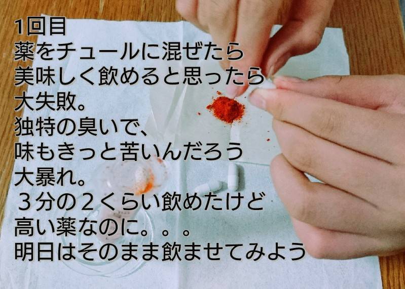 投薬1日目⇒猫に薬を飲ませるのも人生初。チュールに混ぜてみたが大失敗。