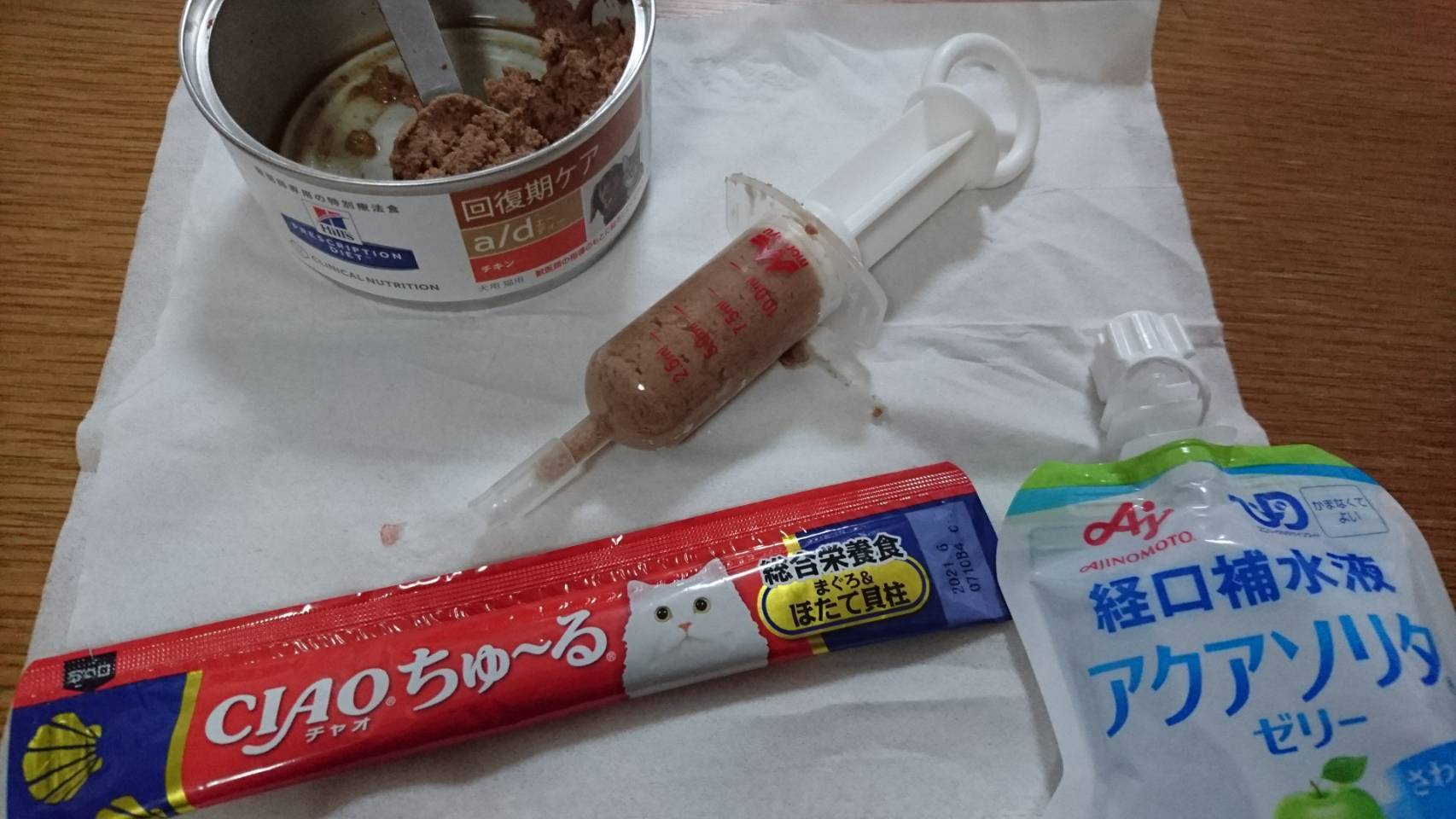 AD缶を1日に3分の1~半分くらいシリンジで食べられるようになったので、もう点滴はしなくてもよさそう。