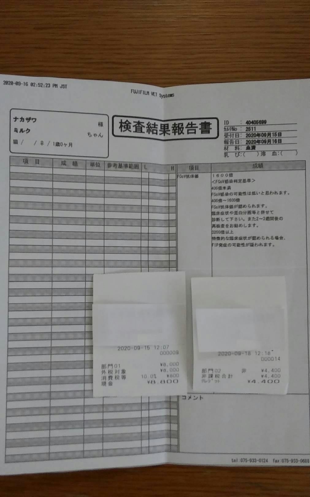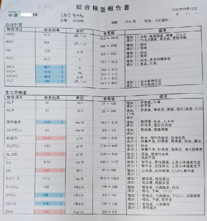 【ミルクFIP闘病報告2021年1月27日】経過観察45日目 血液検査結果のご報告