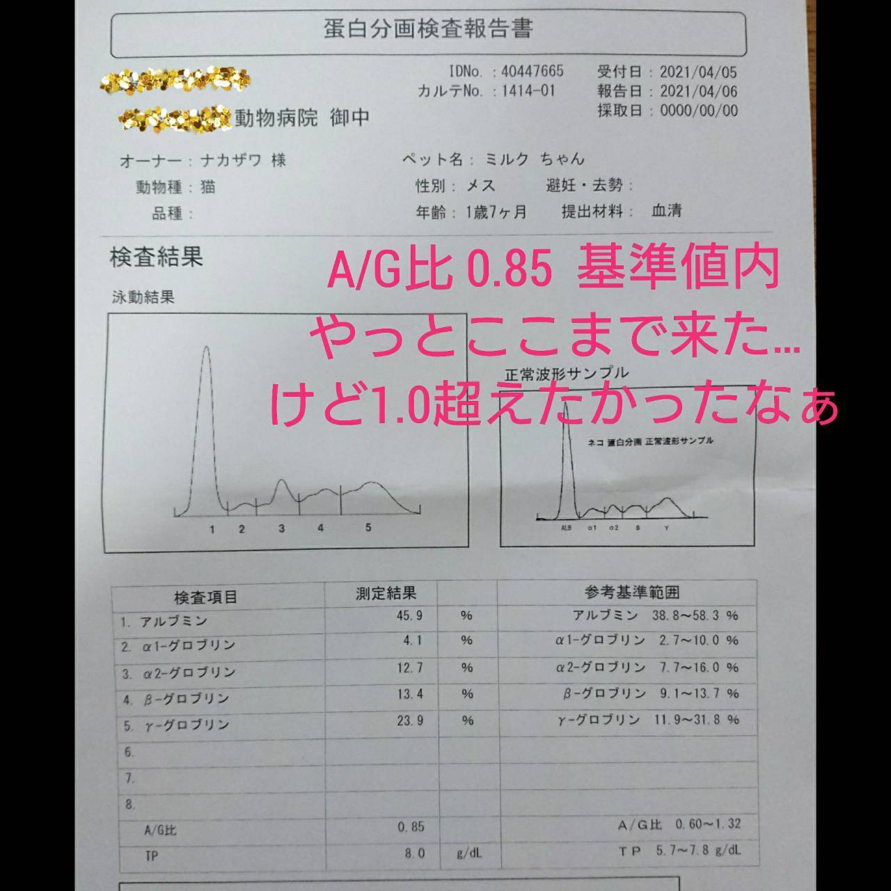 お陰さまで、A/G比やその他の数値も全て基準値内で、特に異常はみられず『とりあえず寛解』とのお言葉をいただき、やっと少し肩の力が抜けた思いがしました。
