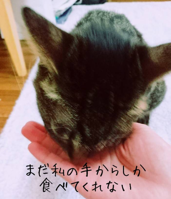 食欲が出てきたようで、自分からすすんで食べるようになってきました。でもまだ一回の量は少なく、少しずつ何回もに分けて与えています。そしてなぜか私の手からしか食べません。