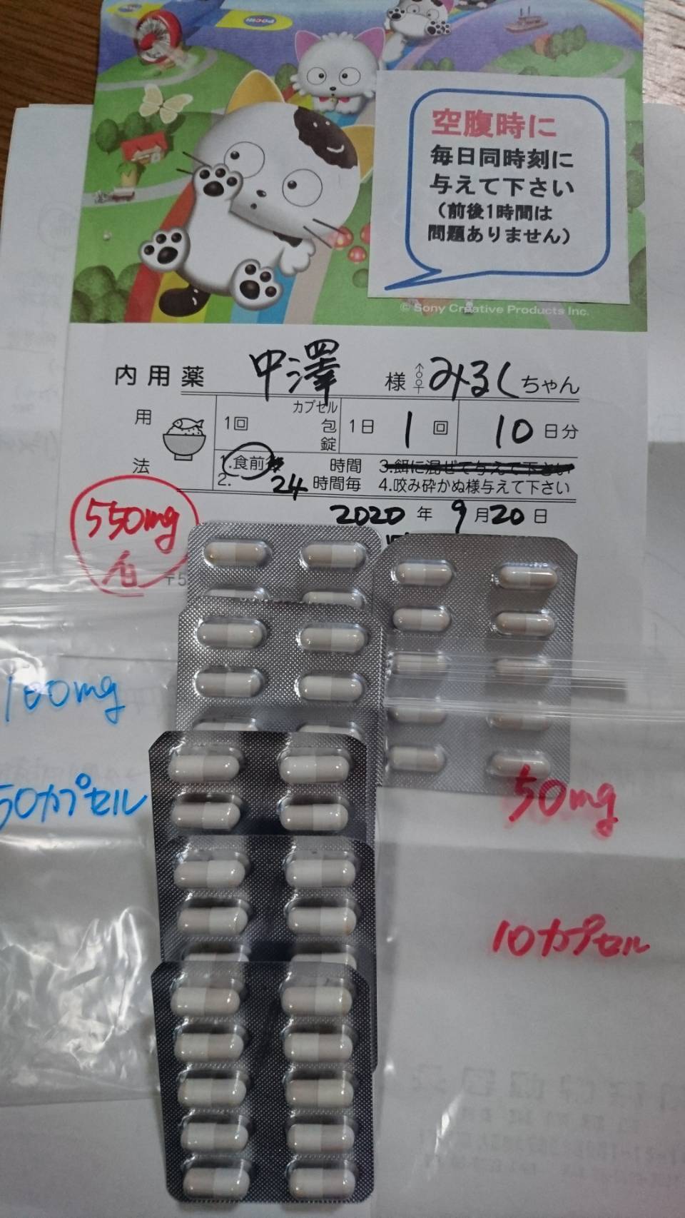 このように、このMUTIANという薬を1日1回毎日同じ時間に84日間、9月21日~12月13日まで投与する予定です。1ヶ月ごとに近所の動物病院で血液検査をしていただき、そのデータを大阪の動物病院の先生にFAXで報告、薬の効果を診ていただく予定となっております。