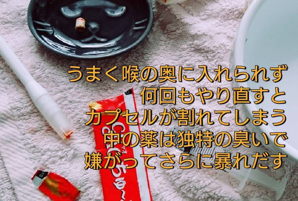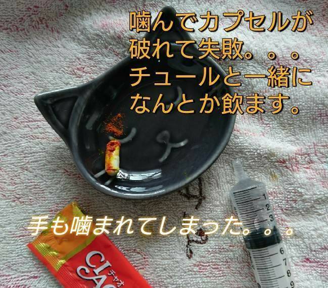 投薬2日目⇒カプセルのまま飲ませる。指を噛まれながらも格闘すること1時間。