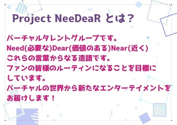 当グループはファンともっと近い距離を、楽しい時間を共有すること、そして皆様のルーティンになることを目的に設立したバーチャルタレントグループです。