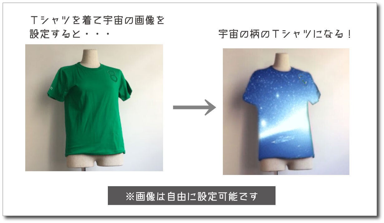 別名グリーンバックTシャツとも呼ばれ、ZOOMなどのオンライン会議ツールで、推しキャラクターや自分のつくったキャラクターなど、お好きなイラストや画像をTシャツに設定すれば、オリジナルTシャツに見せることができます。