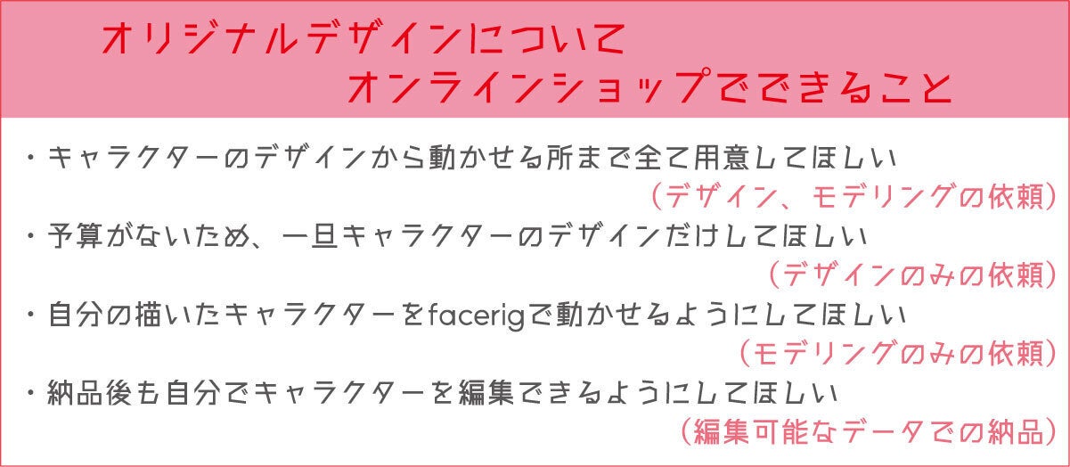 冒頭で説明させていただいたように、オンラインショップでは、「レンタルVTuberの販売」以外にも、オリジナルデザインのVTuberキャラクターの制作も依頼できるようになります。性的描写の強いキャラクター、極度に肌の露出の多いキャラクターはお取扱いできませんが、 次の内容なども含め、みなさんのご要望やご予算に合わせ、臨機応変に対応できるショップづくりを目指していきます。