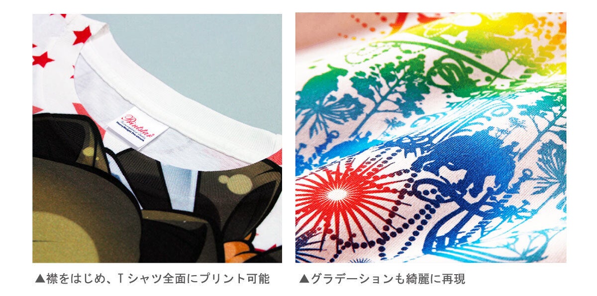 Tシャツの襟首や袖元をはじめ全面にプリント可能なのでインパクト抜群です。プリント業界で最も良く使われるprintstarのヘビーウェイトTシャツに片面(表面または裏面) プリントしてお届けします。