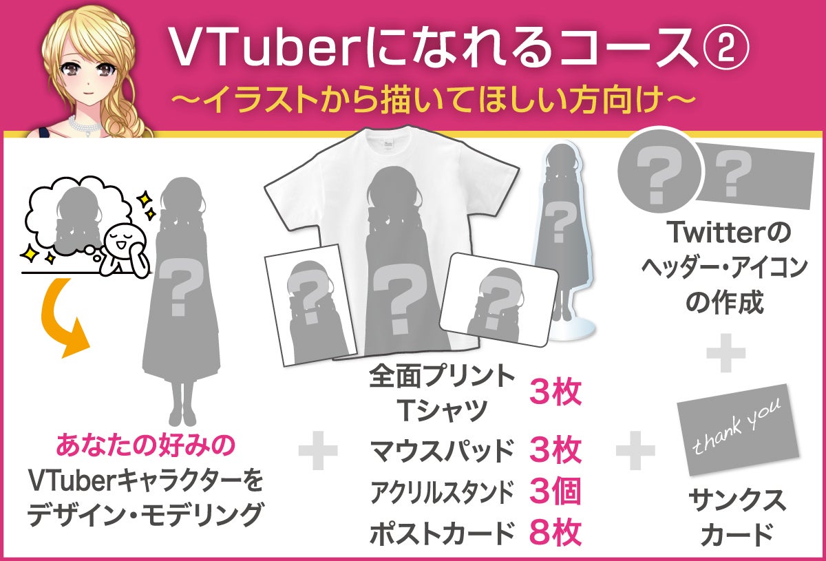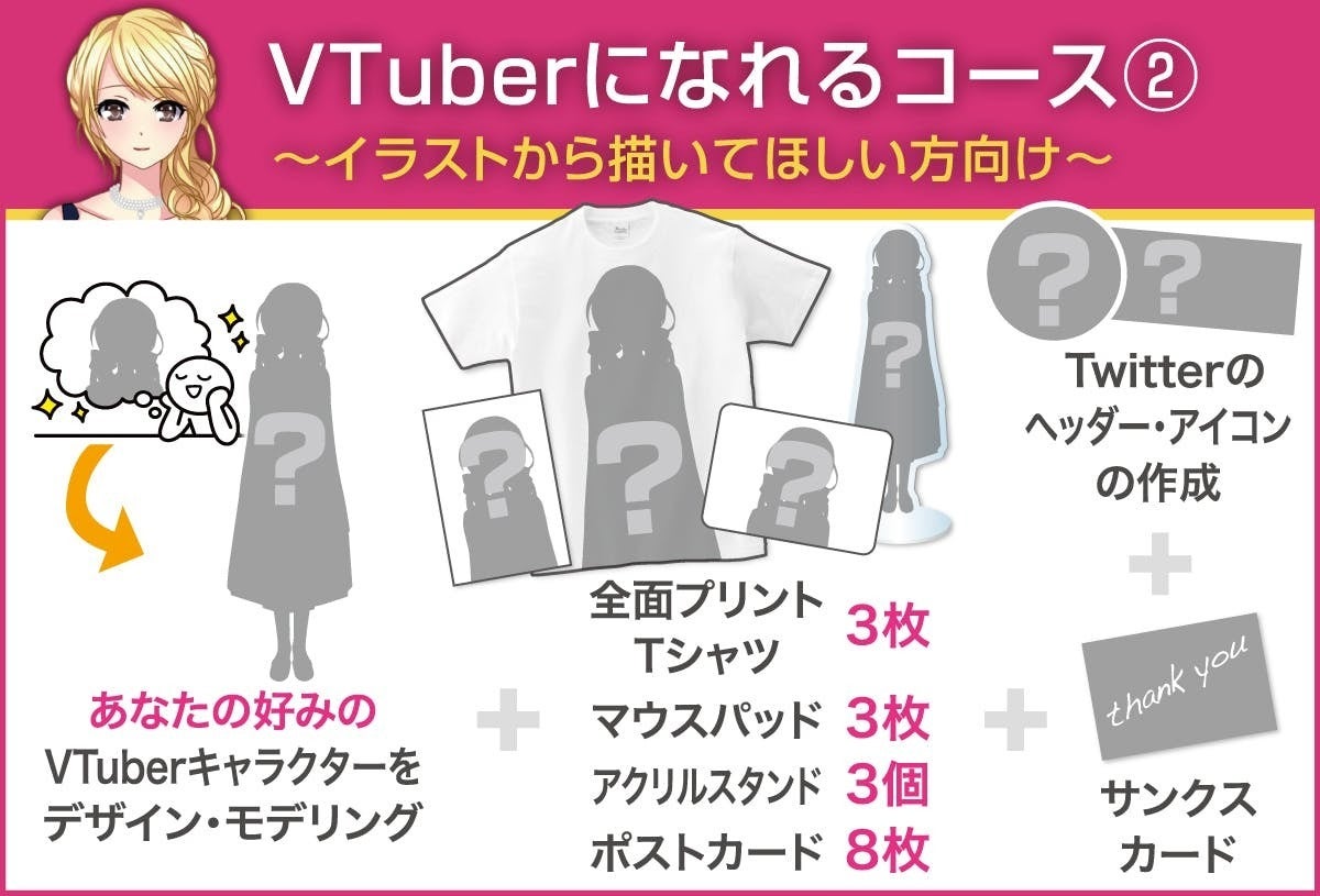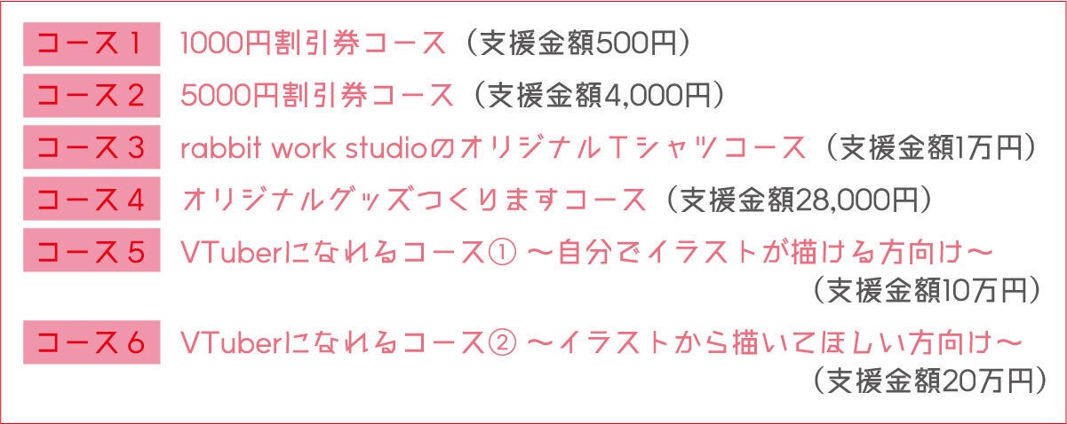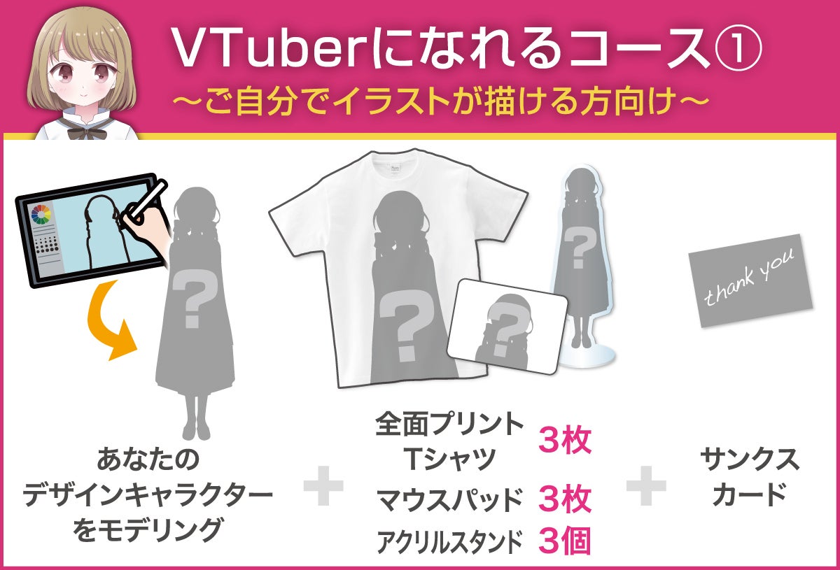 VTuberになるための工程には、「①イラスト作成+②イラストをパーツ分け+③モデリング」の3工程ありますが、そのすべての工程を rabbit work studio で行い、グッズも付いてくるコースです(性的描写の強いキャラクターは作成できません)。具体的なリターンとしては次の4つです。