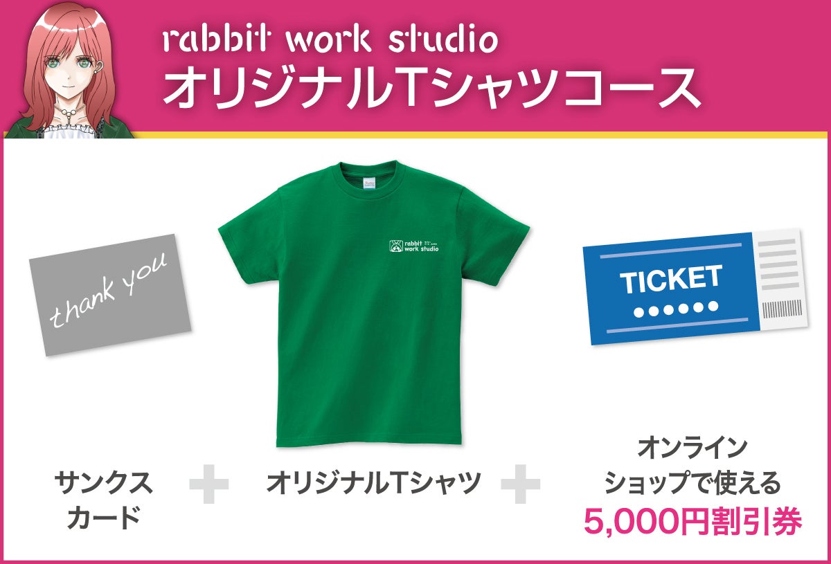 あなたのキャラクター入りのTシャツ、マウスパッド、アクリルスタンド、オリジナルポストカードをつくります。自分で楽しんだり、友人や視聴者にプレゼントしたり自由に活用ください。rabbit work studio はグッズメーカーと提携しているので、かなりお得なコースになっています。Tシャツは、襟首や袖元をはじめ全面にプリント可能。片面プリントです。