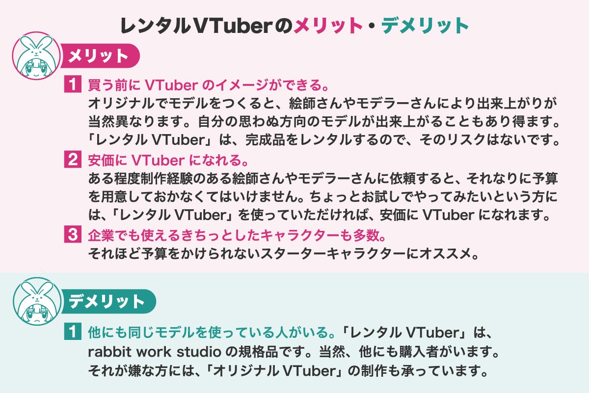 「レンタルVTuber」 とは、私たちrabbit work studioのつくった造語で、私たちの所有するVTuber モデルを安価にお客様に提供するサービスです。