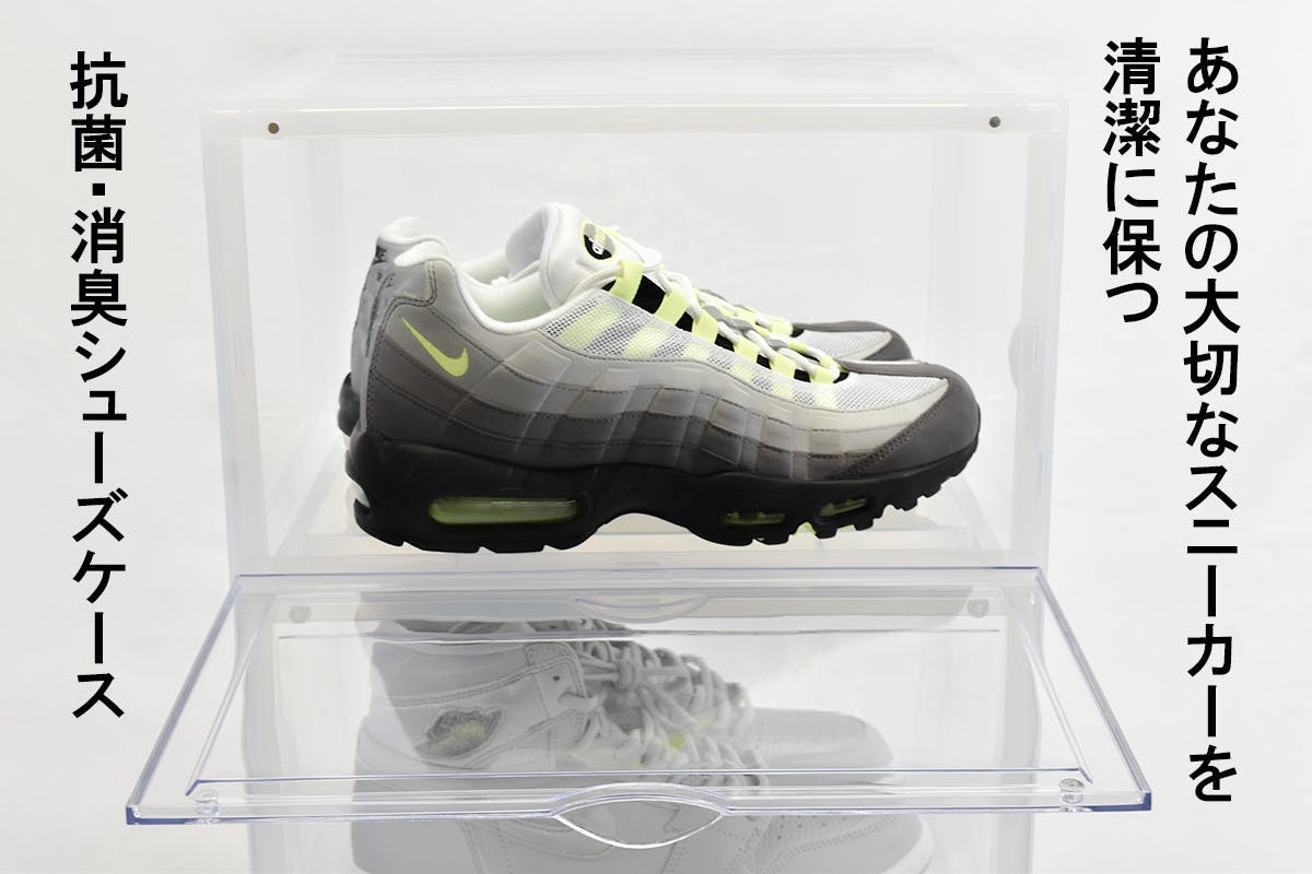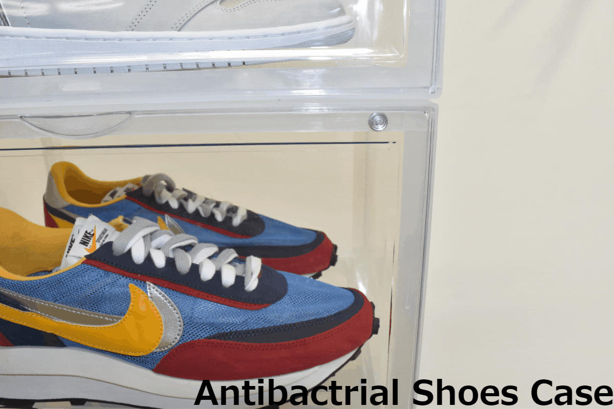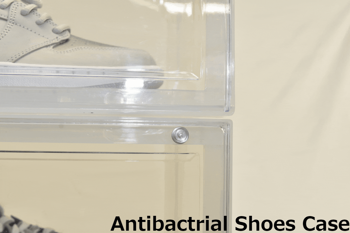 お気に入りのシューズを強調してかっこよく魅せるために、ミニマルなデザインにこだわりました。横向き収納を採用し、ディスプレイ感覚でオシャレに保管できます。全面(開閉口)は非常に透明度の高く、丈夫なプラスチックですのでより中のスニーカーが映えて見えます。抗菌消臭剤を練り込みながら透明度を保ち四方八方からスニーカーのディスプレイを楽しむことができます。