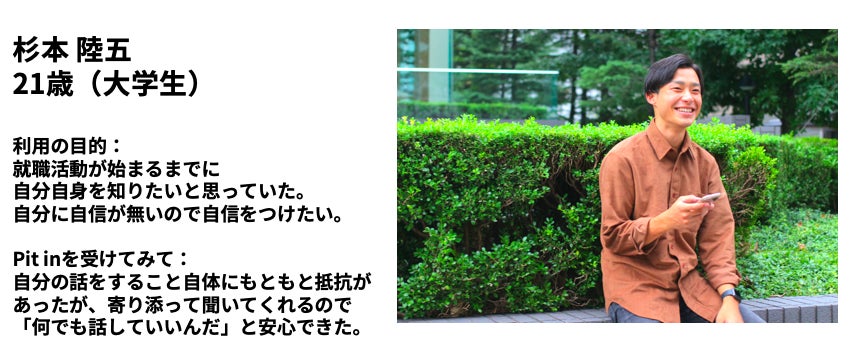 うんうん。それに、悩んでいる人だけじゃなくて、聞き手側として相手に共感できなかったり、自分の時間を奪われているような感覚になってしまう、いつも聞き手で自分のことは二の次、そんな人も安心して自分の為だけの時間を作れるサービスという部分も「Pit in」が魅力的だと思うポイントの1つだと思う。