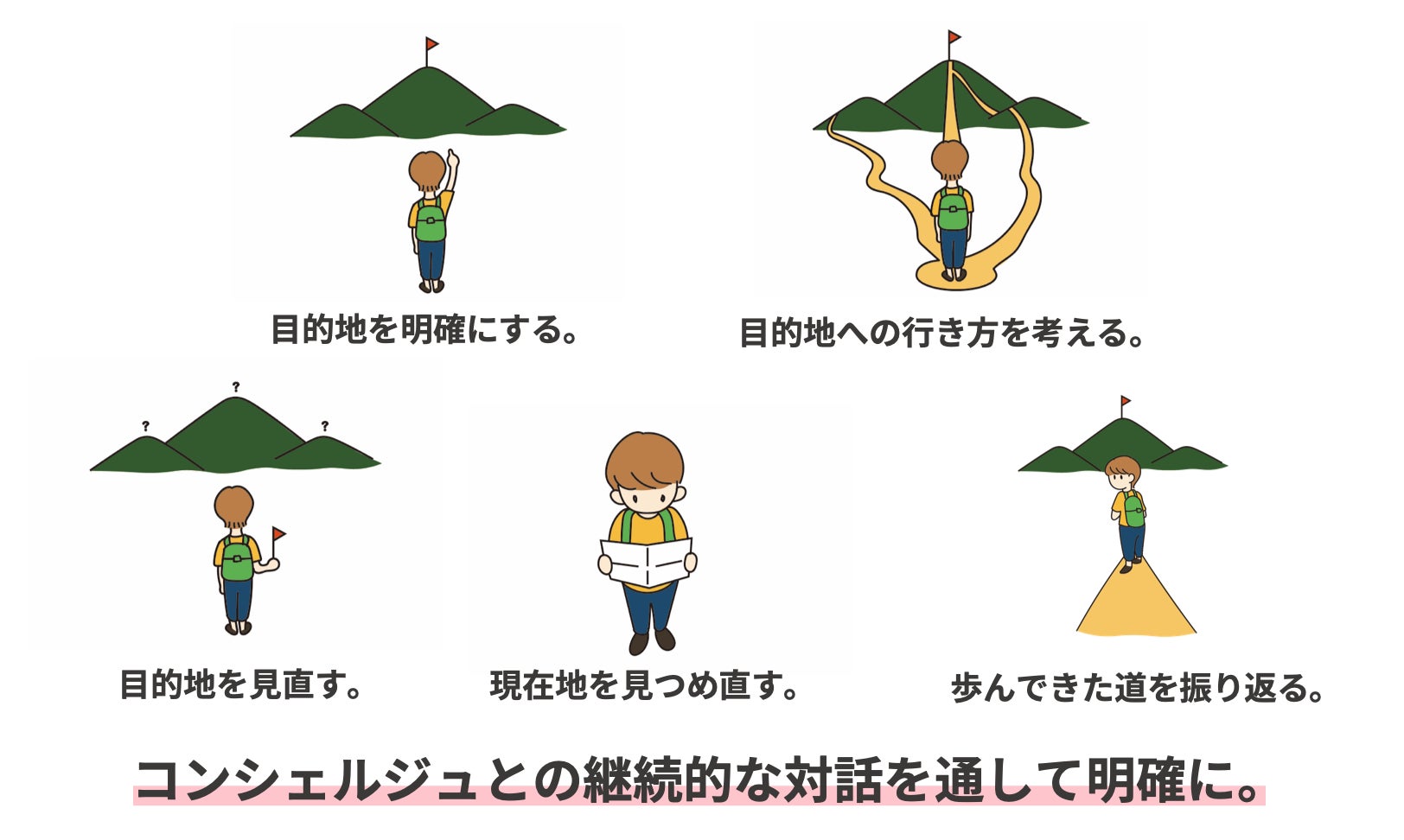 Pit inの聞き手をコンシェルジュと言います。コンシェルジュは利用者の状況に合わせてPit inの60分間で様々問いかけや掘り下げを行い、気付きを共有します。コンシェルジュはときには応援者、ときにはコーチ、ときにはカウンセラーのような役割としてあなたと伴走します。