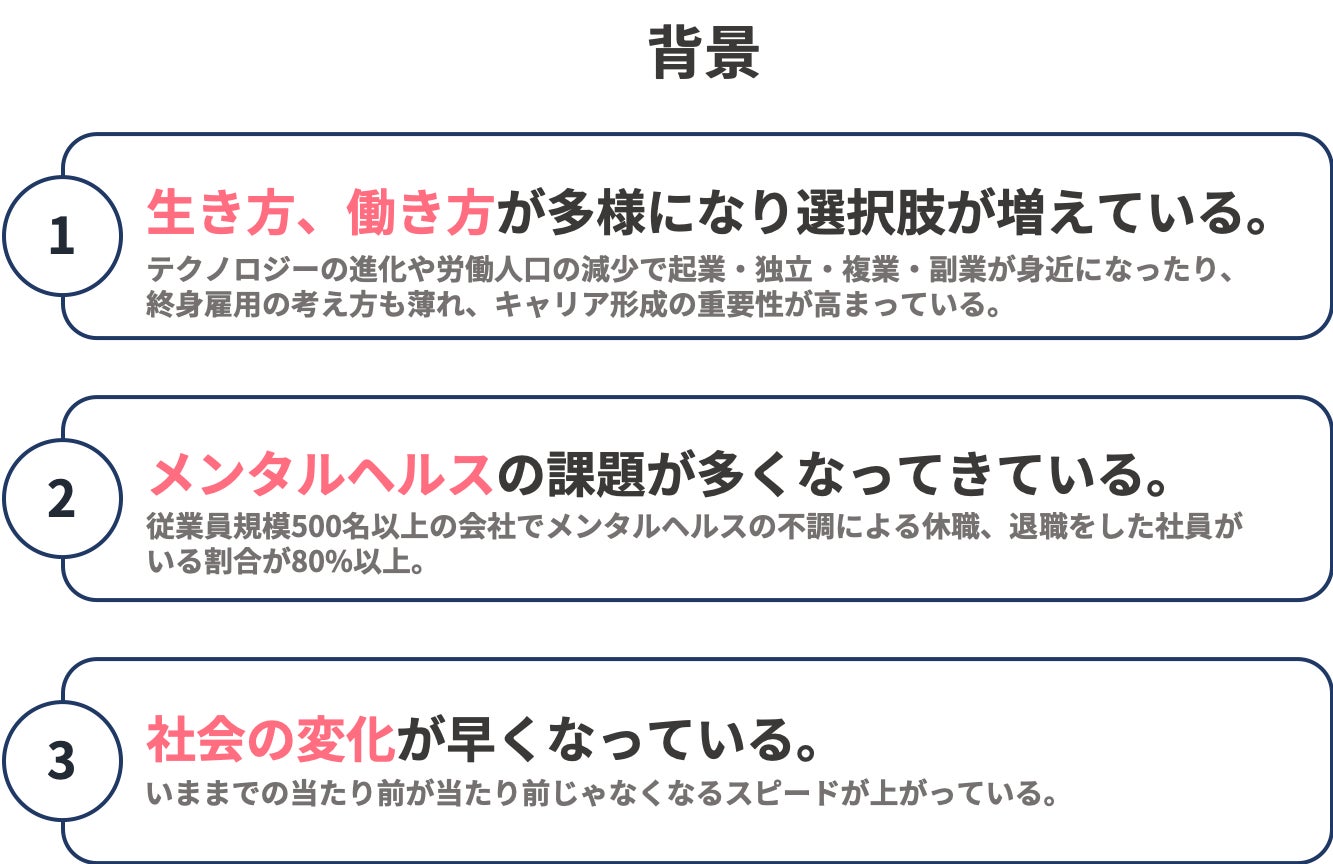 社会の変化が早く、予測不能さが増していく現代において、心と頭を整え、自分自身の指針やあり方を見つめ直しアップデートさせていくことで自分らしい人生を歩むことができると信じています。