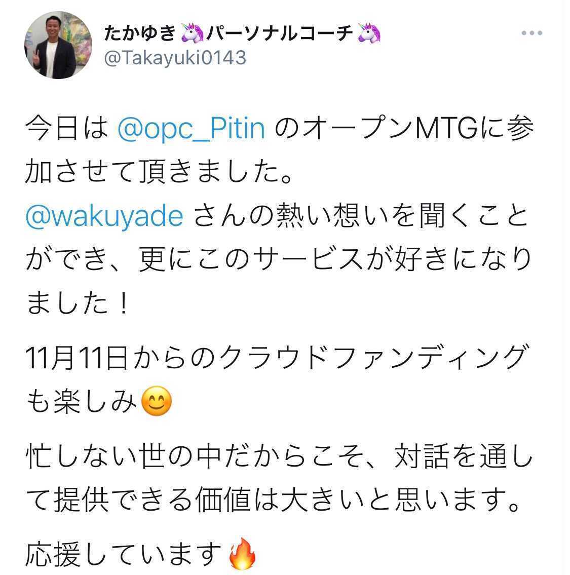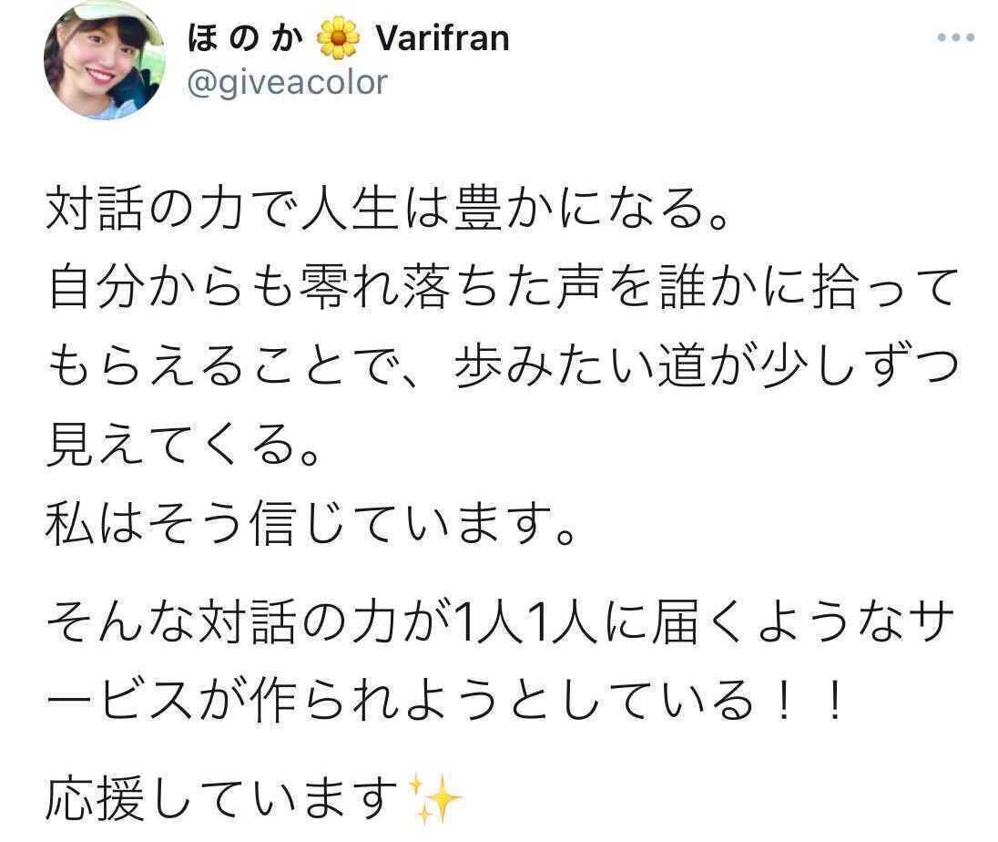 オープンMTG参加頂いた方やクラウドファンディングのページをご覧いただいた方からたくさんのメッセージをいただいております!対話の価値を感じ取っていただいたことを嬉しく思います。皆さんから頂いたメッセージをうけてさらに良いサービスを作れるようにがんばっていきます!