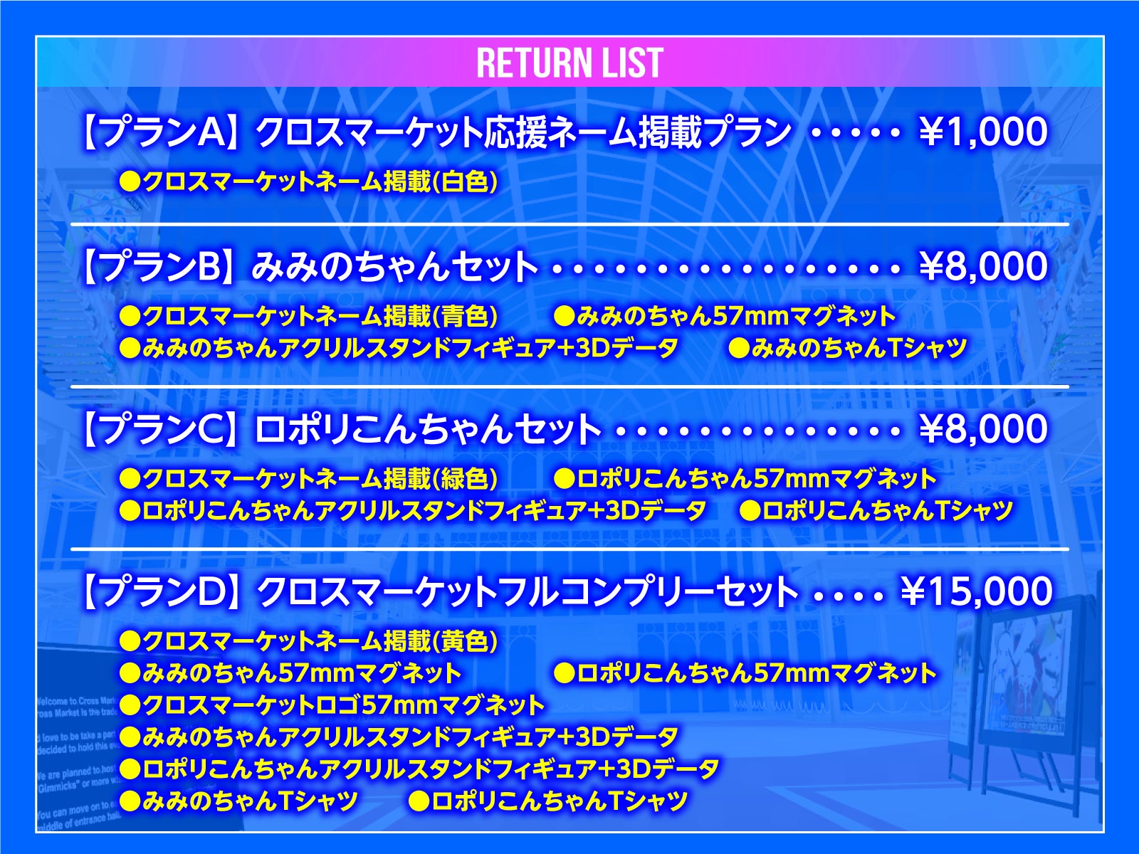 とりあえず支援したい人向けのプランです!クロスマーケット2のエントランスに白色のネームが刻まれます。バーチャル世界にあなたのネームを刻んでみませんか?