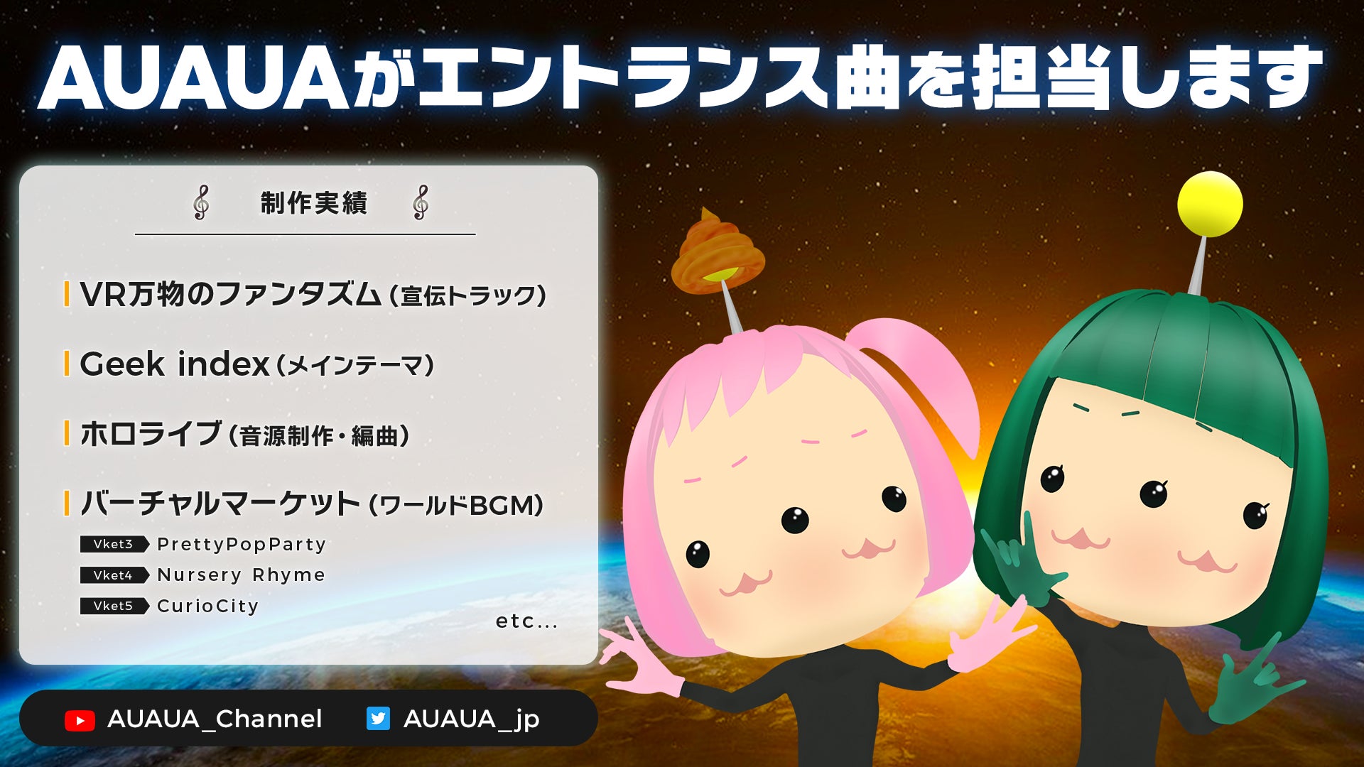 万物のファンタズムやGeekindex、ホロライブやバーチャルマーケット等の楽曲を担当したAUAUAによるエントランスBGMデータを配布いたします!こちらはデータ配布となりますので、いずれかのプランを支援して頂いた方(応援ネーム掲載プラン含む)全員に配布いたします!