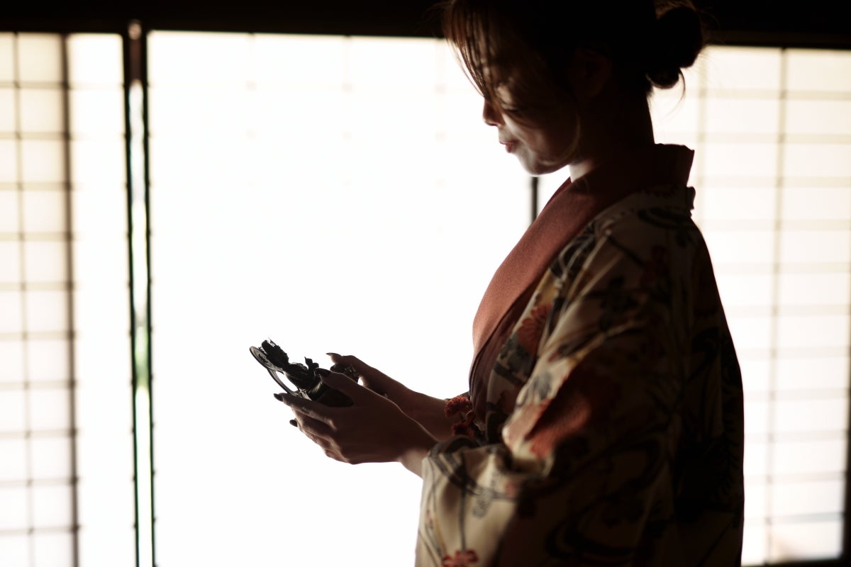 京都伝統の和傘を使った柔らかな光の下で、