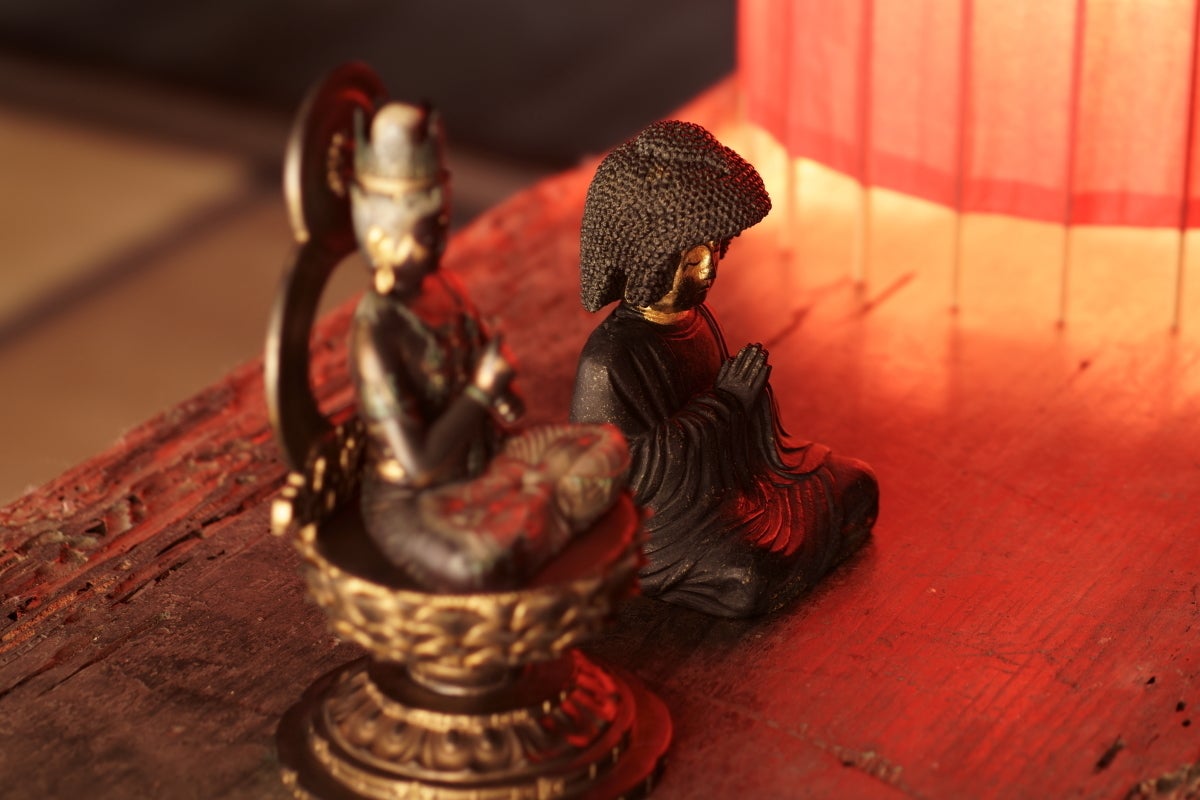 仏像たちを京都伝統の和傘を使った柔らかい照明の光で演出します。