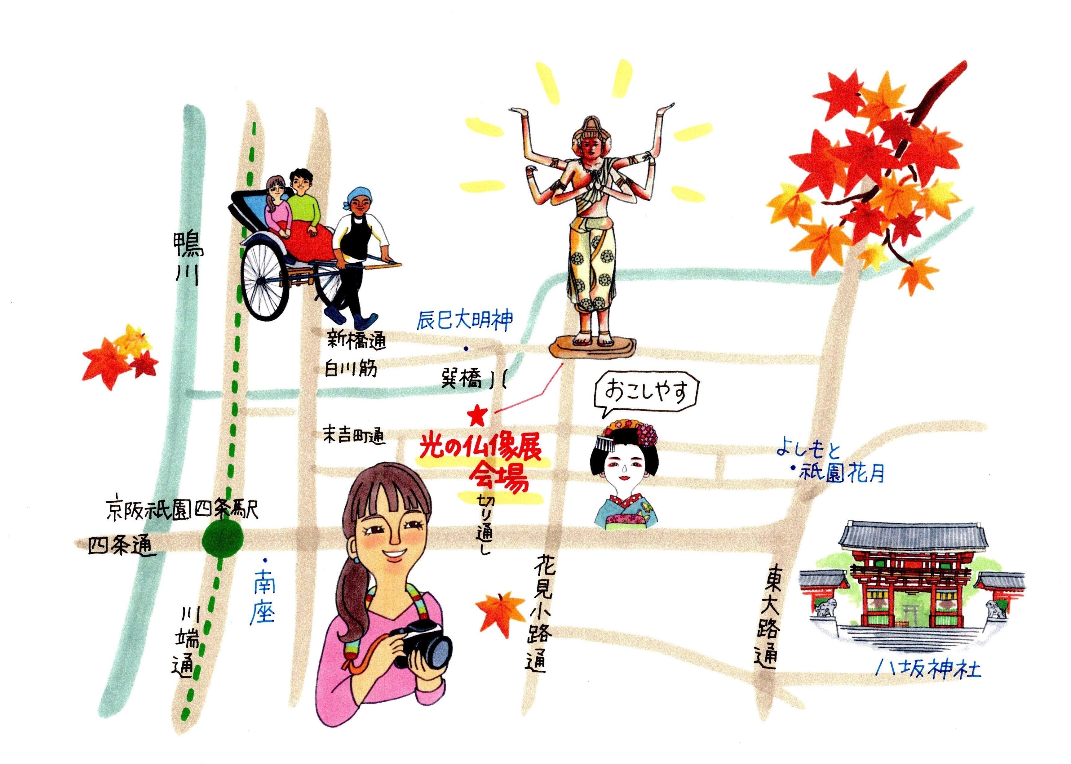 祇園四条駅から徒歩5分程度の場所に展示会場があります。祇園四条駅から、四条通(祇園商店街)を八坂神社の方面へ歩きます。花見小路通りまで行きましたら、左折してください。そのまま花見小路の景観を楽しんでいただき、目の前に辰巳大明神、その左手に巽橋が見えましたら、巽橋を渡っていただき、細道を少し進んでいただいた右側の角が展示会場となります。場所が分からない場合はスタッフがご案内いたしますのでお問い合わせくださいませ。※周辺にコインパーキングが何か所かございますので、お車で来られる方は駐車場をご案内いたします。