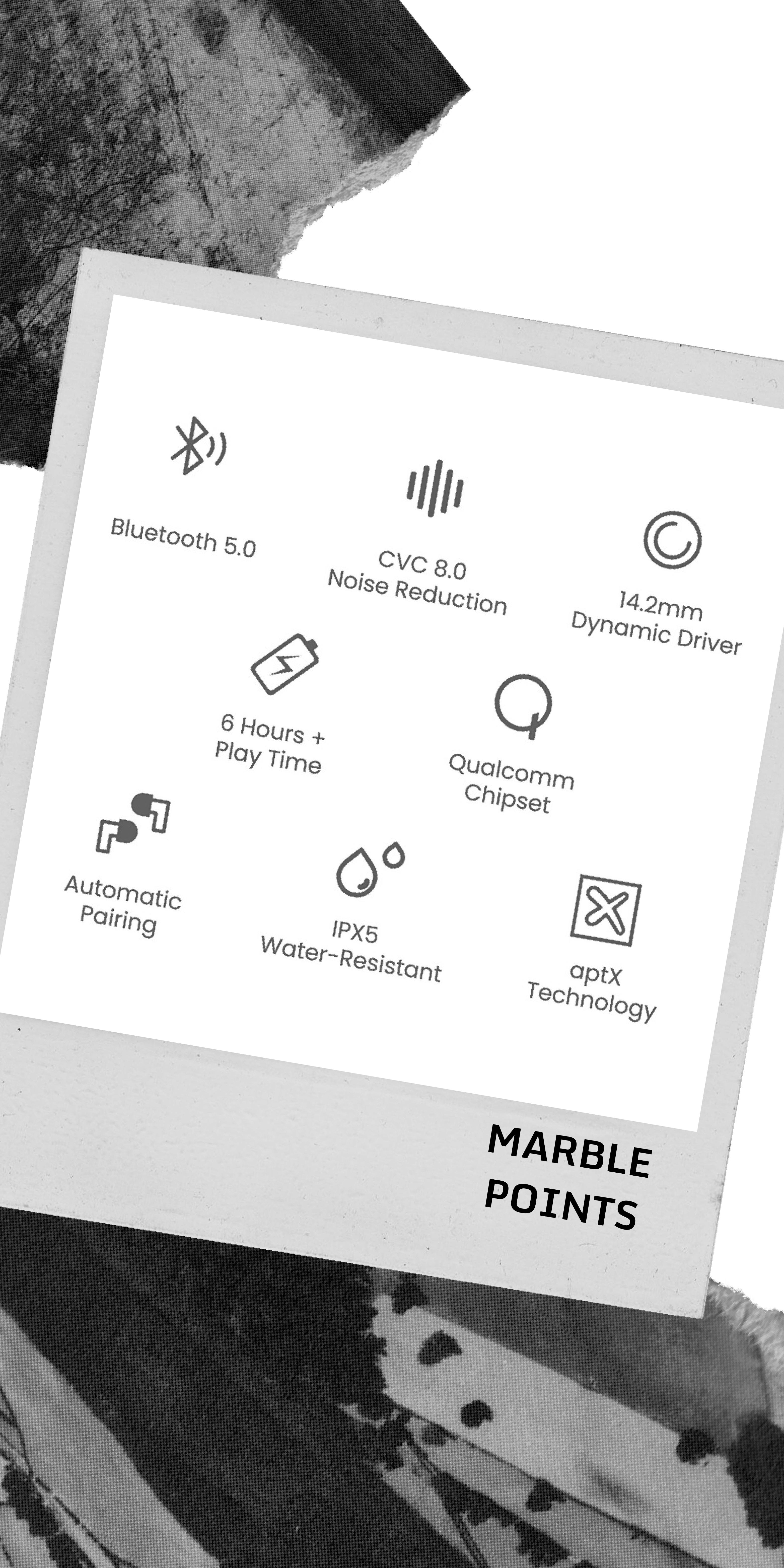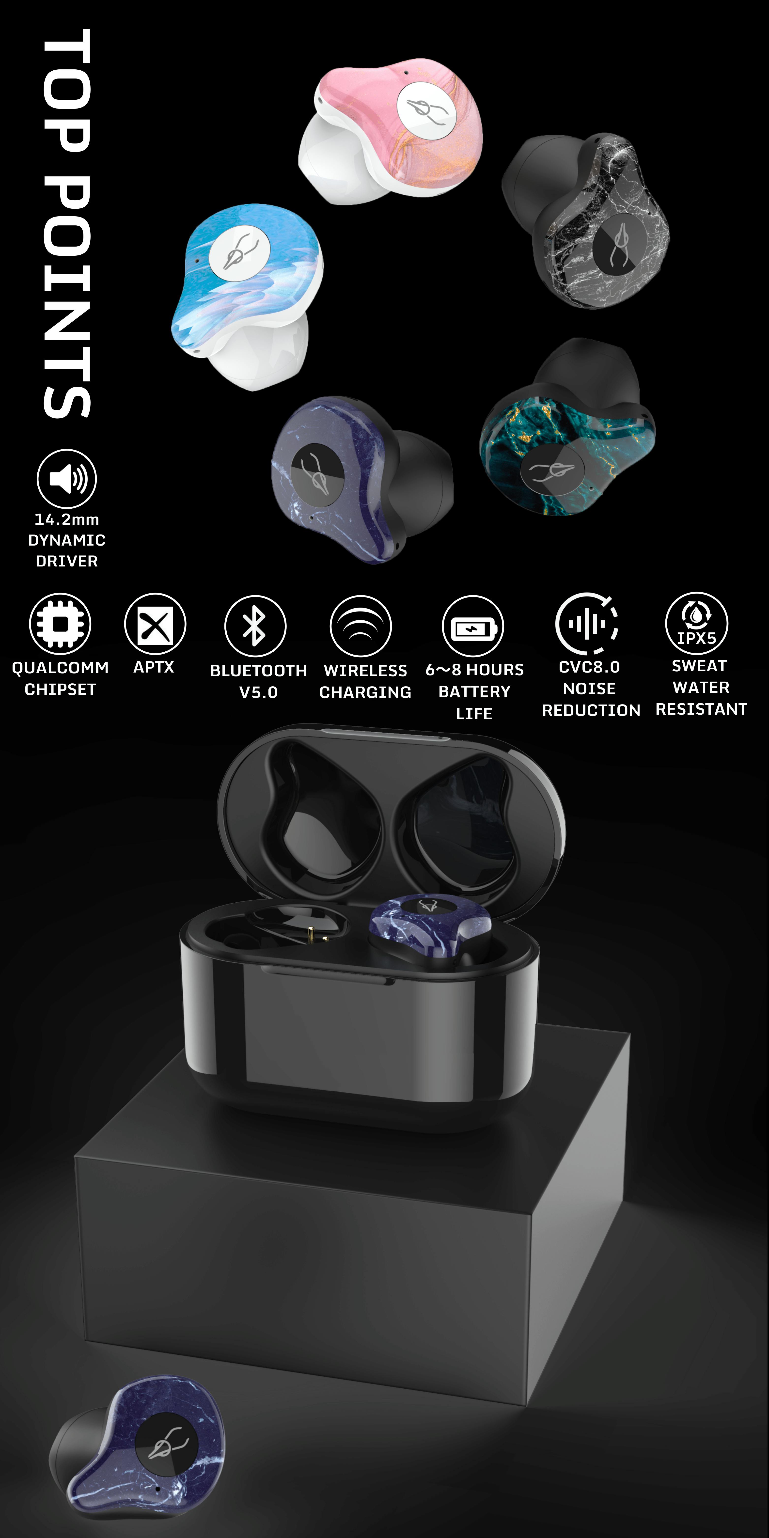 ワイヤレスイヤホン『X12 MARBLE』は半導体大手 QUALCOMM社の最新チップセットを搭載し、ノイズの90%以上をフィルタリングします。音楽やビデオ、ゲームなども安定したBluetooth接続とリッチな高音質を楽しめます。会話の度に音楽を止める必要ありません。急速充電機能付、1時間で満タンに