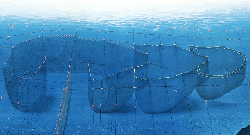 (図:ホクモウ株式会社。定置網模式図。魚は左下から網に入り右へ右へと移っていきます。漁獲するのは右端の魚のみになります。)