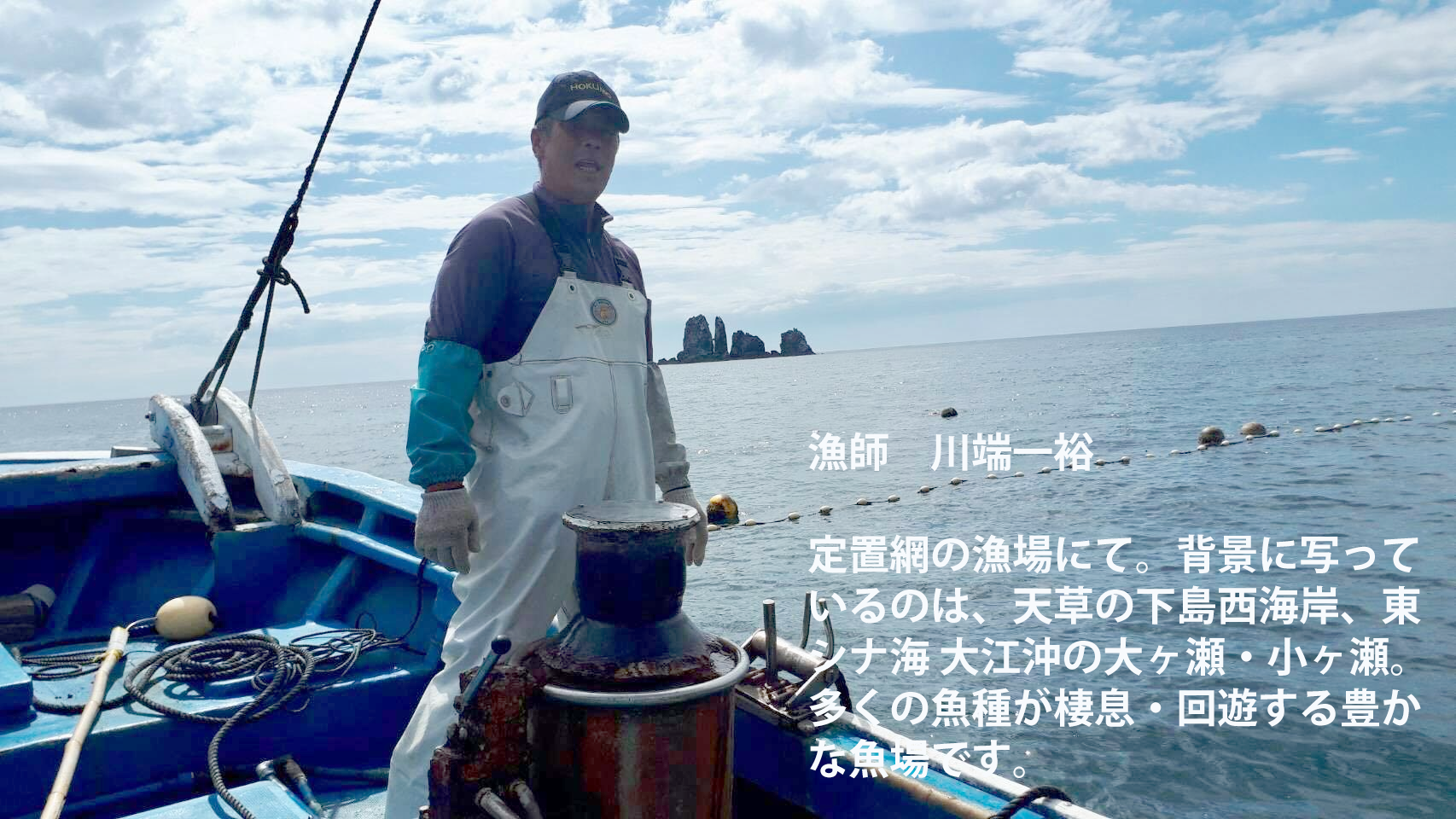 川端水産では、熊本県天草下島の西海岸で親子2代の定置網漁をしています。