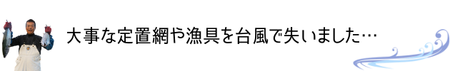 しかし、今年に入って加工所を増築し、秋〜冬の漁期へ向けた準備を進めていた矢先、台風9号の高潮被害に見舞われました。大潮の時間と台風最接近の時間が重なったことで、手入れを終えたばかりの定置網や仕掛け、さらには漁具倉庫など、漁に必要なすべてが壊滅的な被害を受けました。