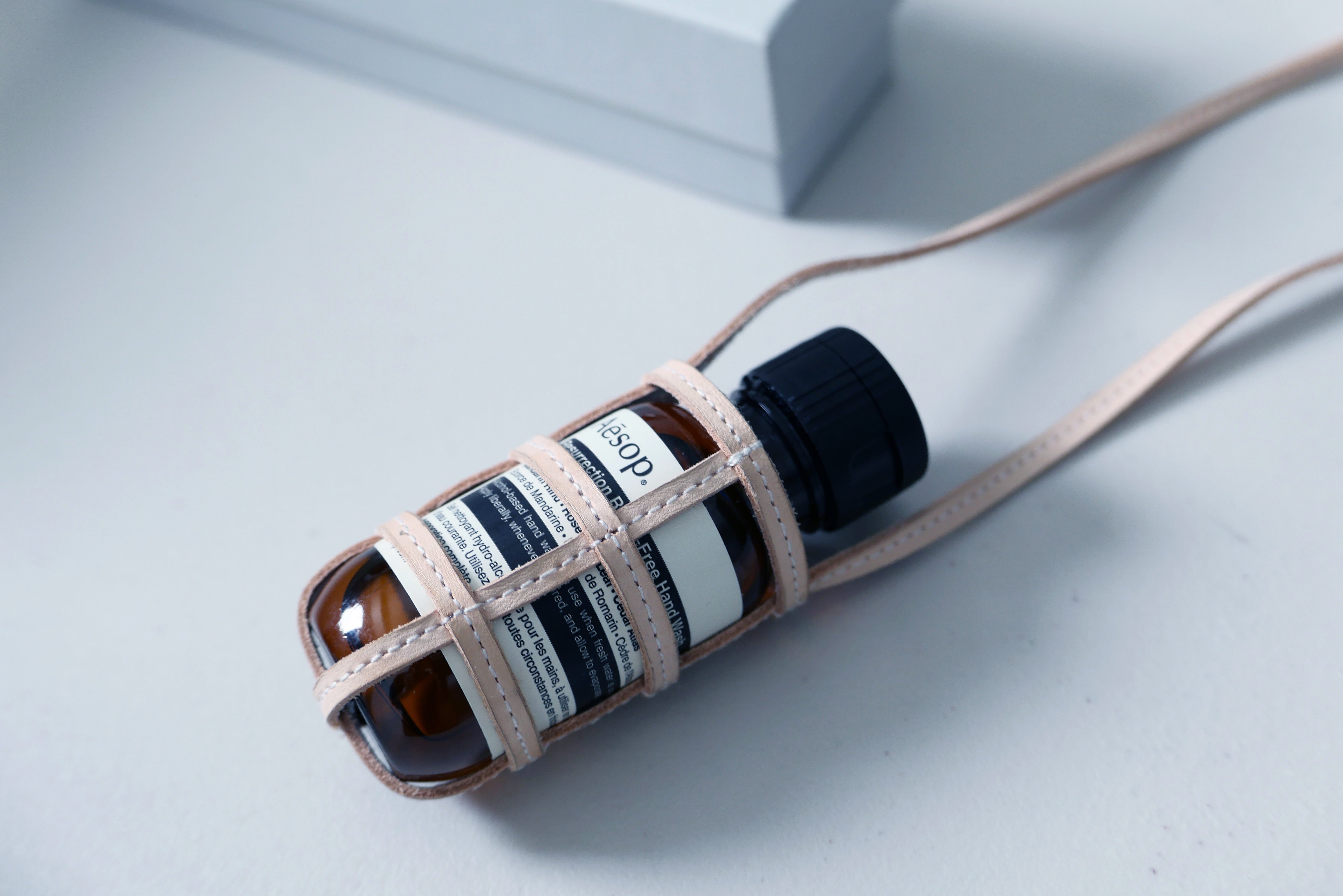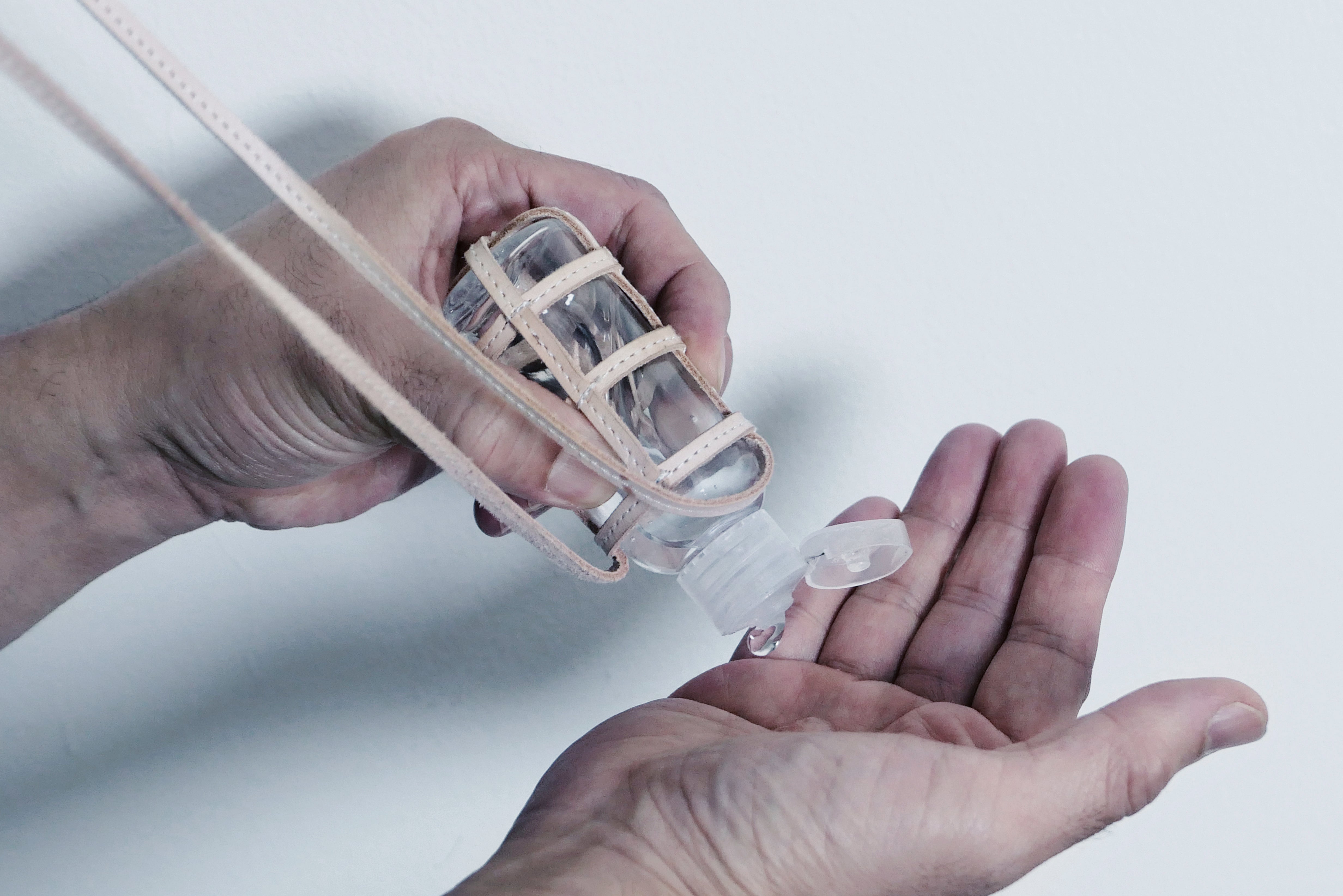 オリジナルの消毒アルコールハンドジェル用の本革ネックストラップです。