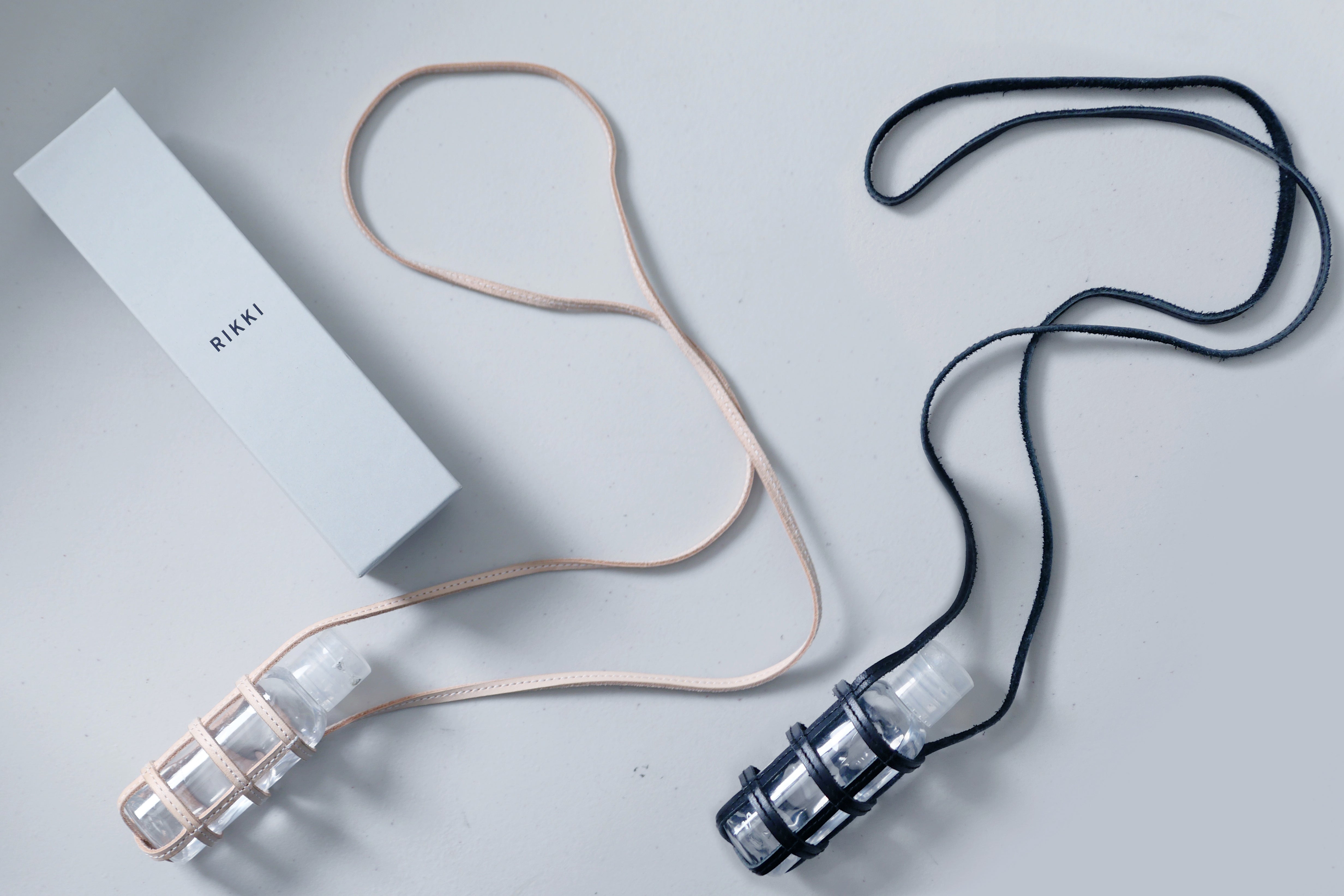 4.【デザイナー自身がご自宅へお届け】消毒ハンドジェル本革ネックホルダー <ナチュラル+ブラック>2個セット