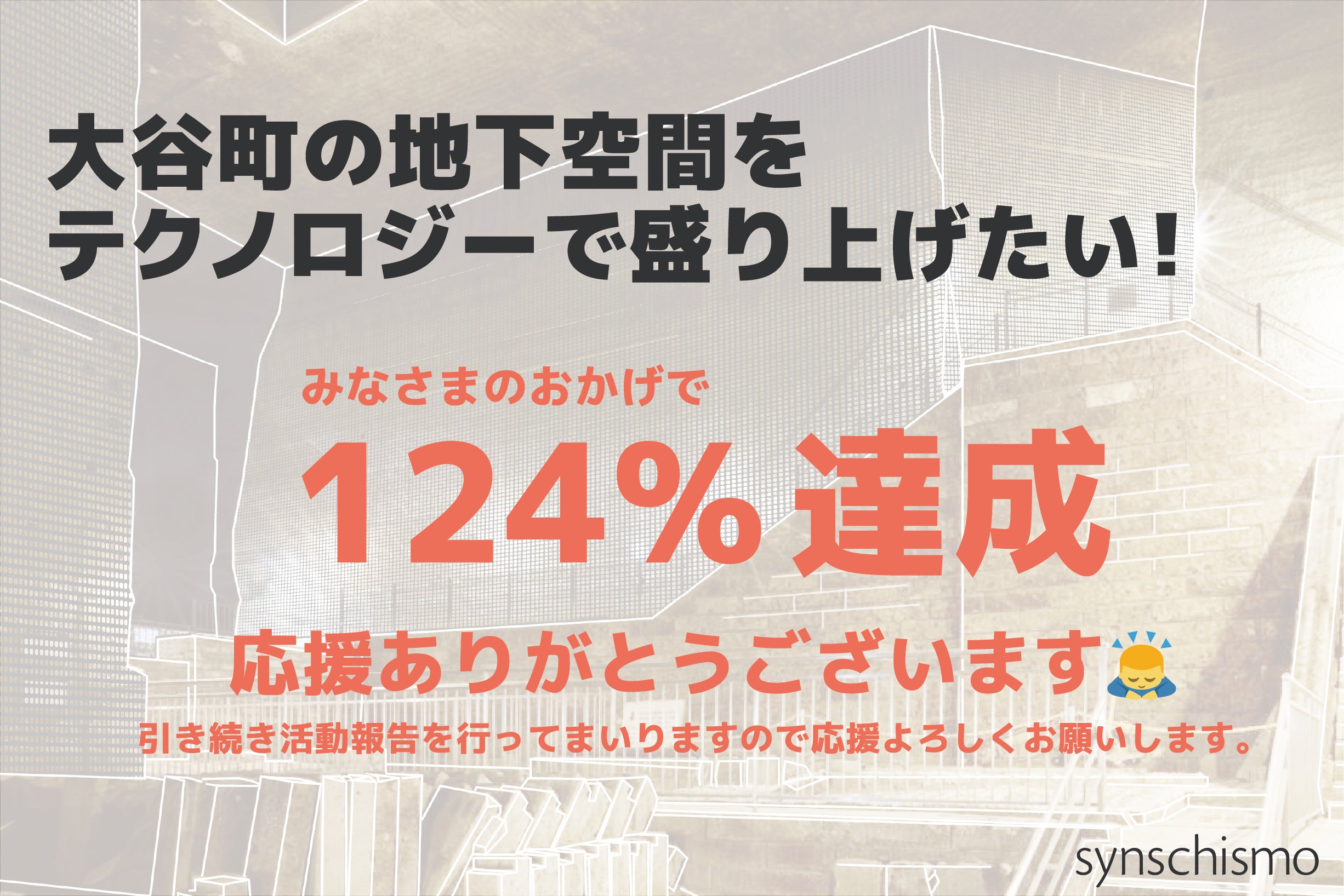 synschismoの青木です!この度は、デジタル大谷プロジェクトにご支援いただきありがとうございます。公開19日目で目標金額100%を達成することができました!!本当にたくさんの方に応援頂きメンバー一同、感謝の気持ちに溢れております!これからも多くの方に認知していただき、大家の地下空間を盛り上げていきたいと思いますので、ひきつづき活動の応援よろしくお願いいたします!!