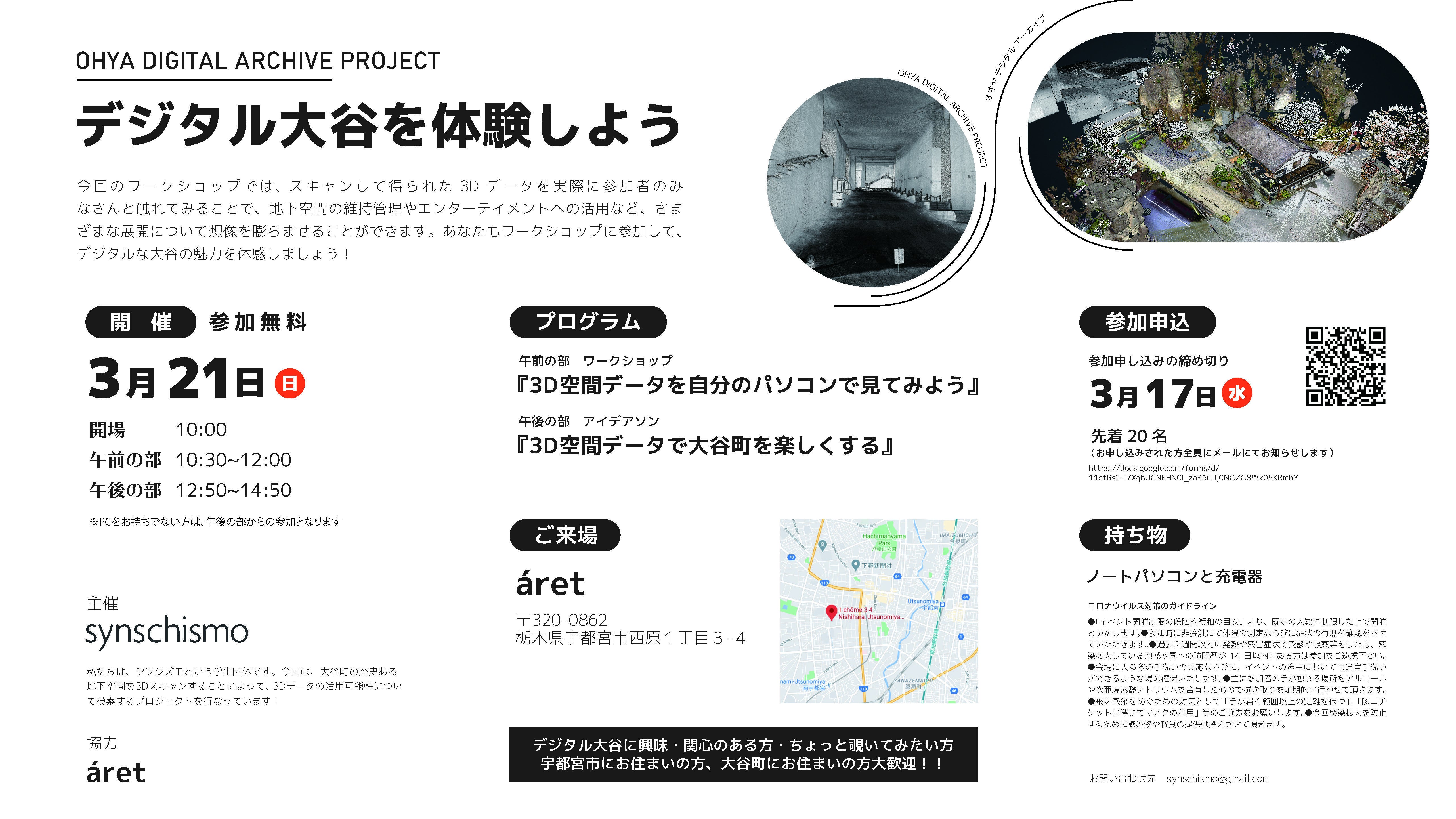 さて、このプロジェクトを通して得られた3D空間データ(以下、点群データ)を地域の方々にこそ触れていただきたいという想いと、私たちの活動を地域の方にもっと知っていただきたいという想いから、3月21日にイベントを開催することといたしました!