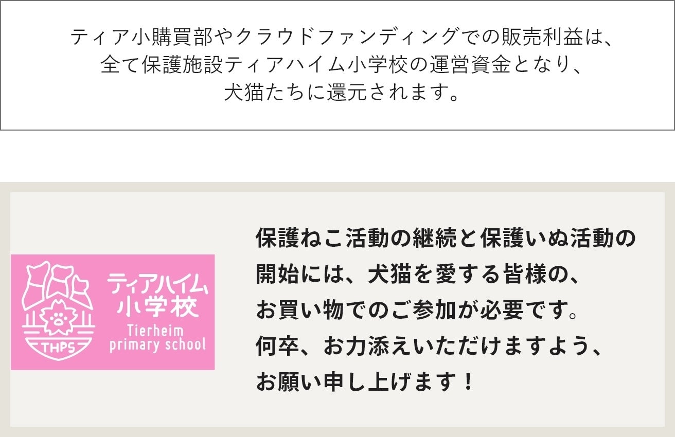 また、これまで保護活動といえば、ボランティアさんたちの負担があまりにも大きく、各々が無理をしながら気持ちで維持されている現状がありました。こうした背景の中、通販サイト「ティアハイム小学校 購買部」で自ら稼ぎ、運営資金を寄付のみに頼らず、お世話をするスタッフには給与が支払われる、持続可能な保護活動の運営を目指しています。