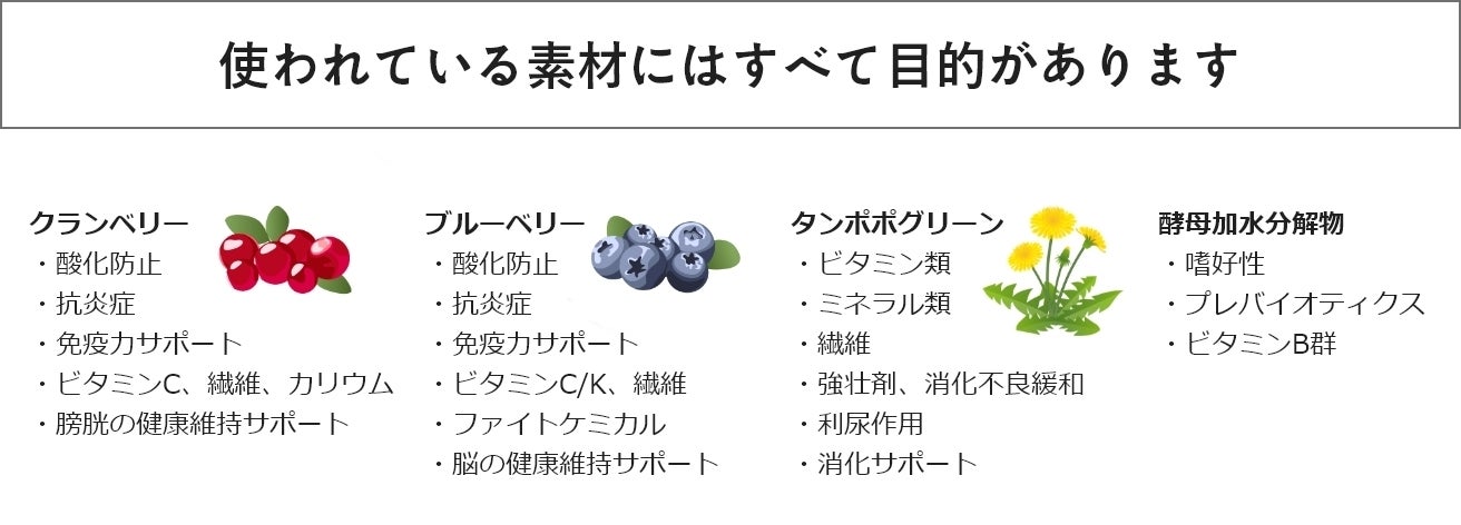 酸化防止としてクランベリー・ブルーベリーが配合されています。