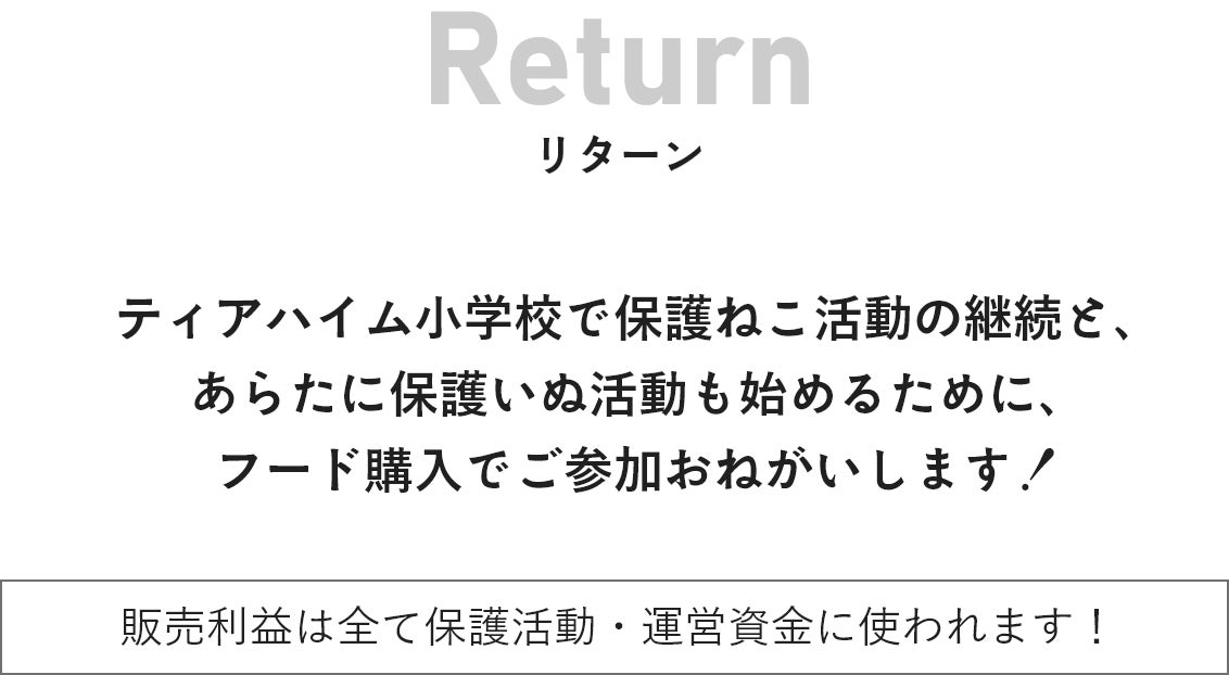 リターンの猫砂を気に入って頂いた方が、今後も継続的にご購入いただくことで、寄付商品として利益が当校の運営費になる。そんな商品を増やしていくことで、販売収益による安定した運営をしていきたい。そのモデルケースを各地に広めて、より多くの猫たちを救いたい。そんな夢です。