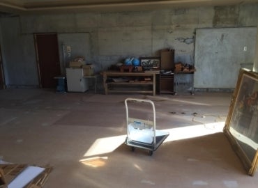 内装解体が途中まで進んで保留となっている元校長室、ここは開校時から犬部屋にする予定にしていました。まずはフロア改装をし、一般の方やボランティアさんに、譲渡会に使ってもらえるオープンスペースとして開放します。