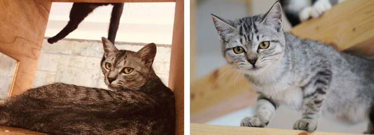 小さなサバトラ姉弟ちゃん。ふたりともちょっぴり臆病で、まだ「怖がりシャー」が出て隠れてしまいますが、攻撃性は皆無。家庭環境に入ってなでなでしてあげ続ければ、きっとすぐ心を開いてくれると思います^^
