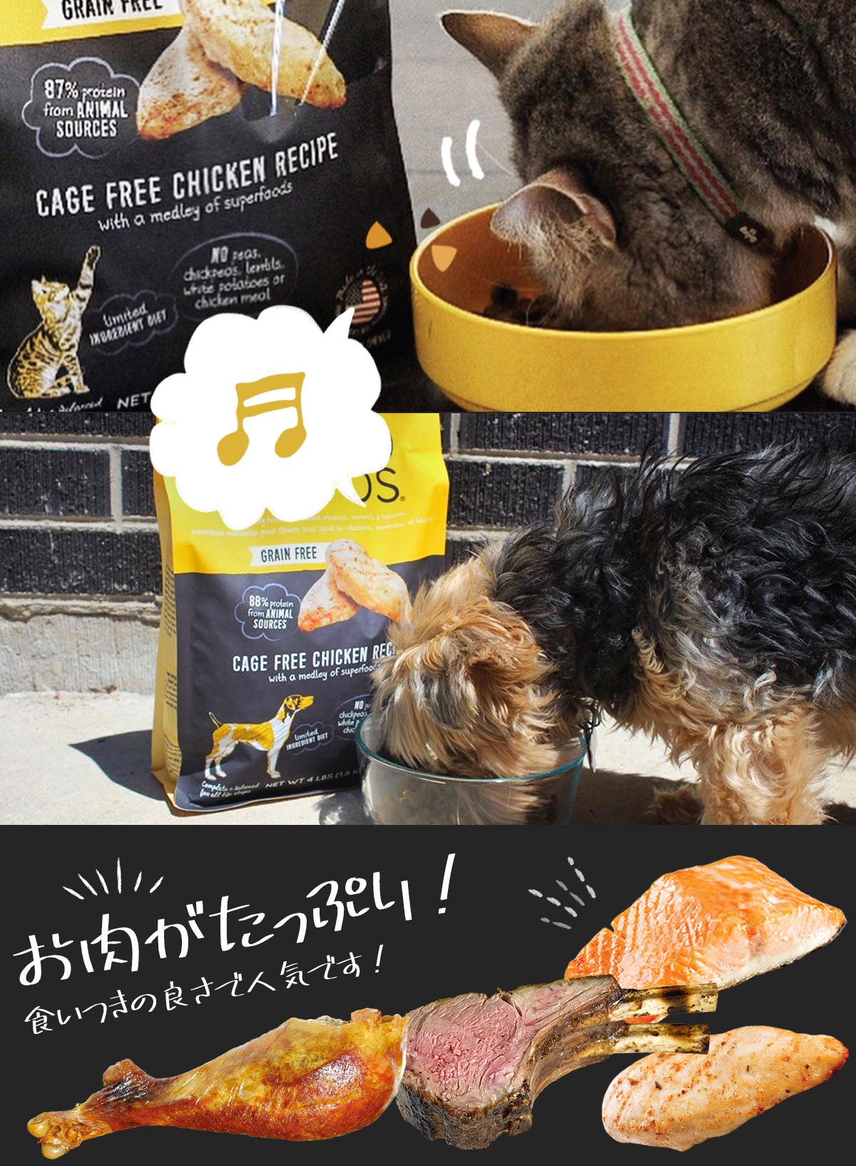 新鮮なお肉をたっぷり使っているから、ワンちゃん猫ちゃんが喜ぶ美味しさなんです。
