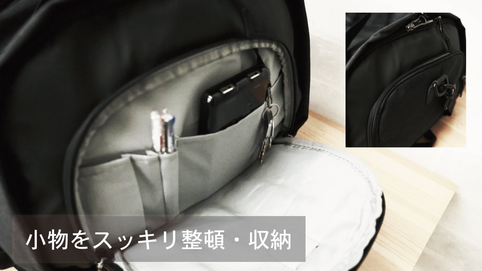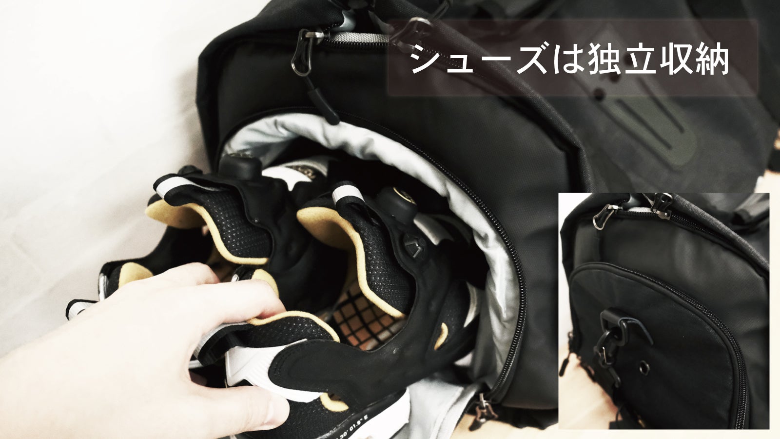 サイドのポケットは独立した空間になっており、シューズやカメラ等少し大きな荷物を分けて入れたい時に最適です。