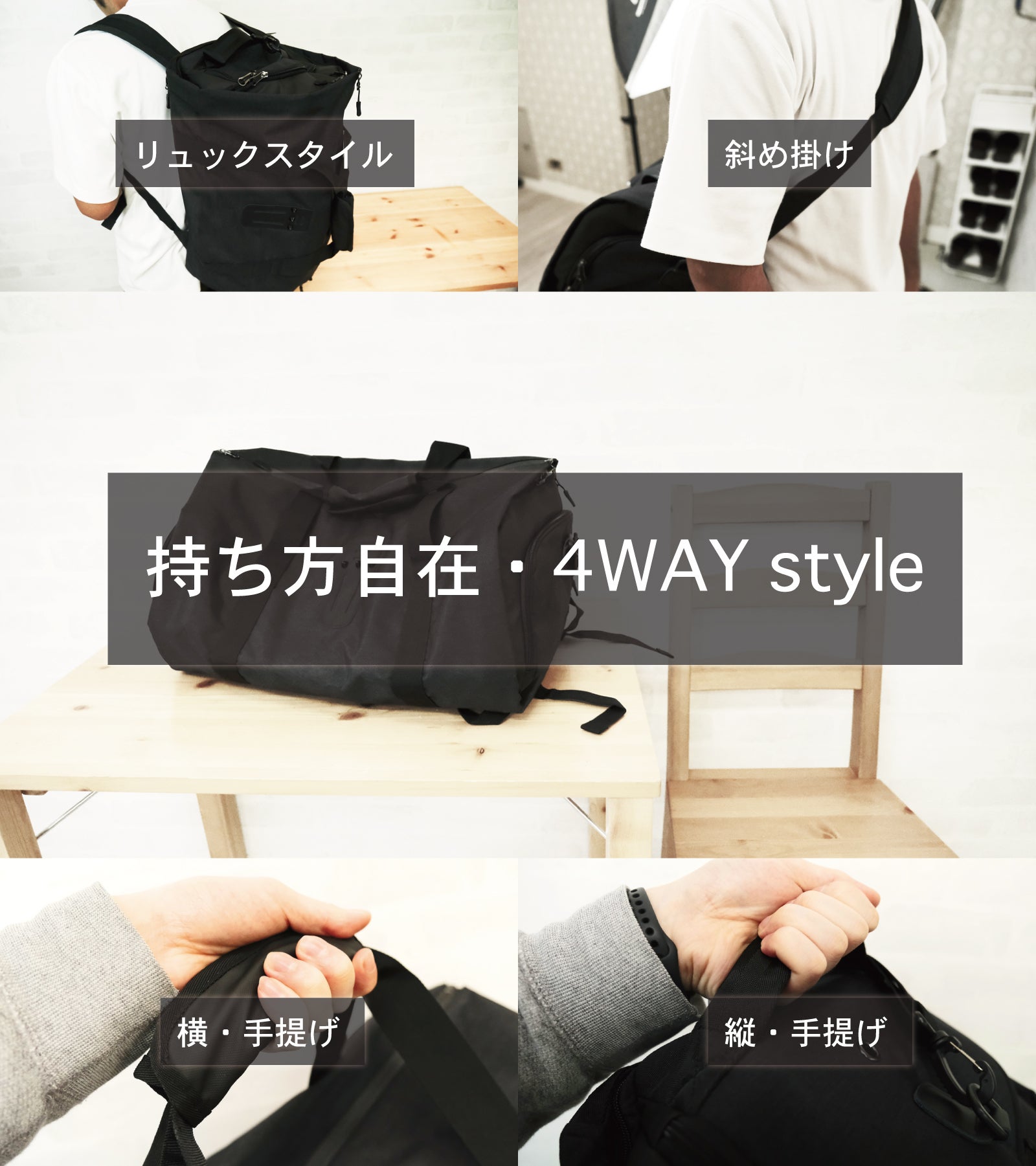 また、リュックスタイルや斜め掛け(付属のショルダーベルトを使用時)もできます。