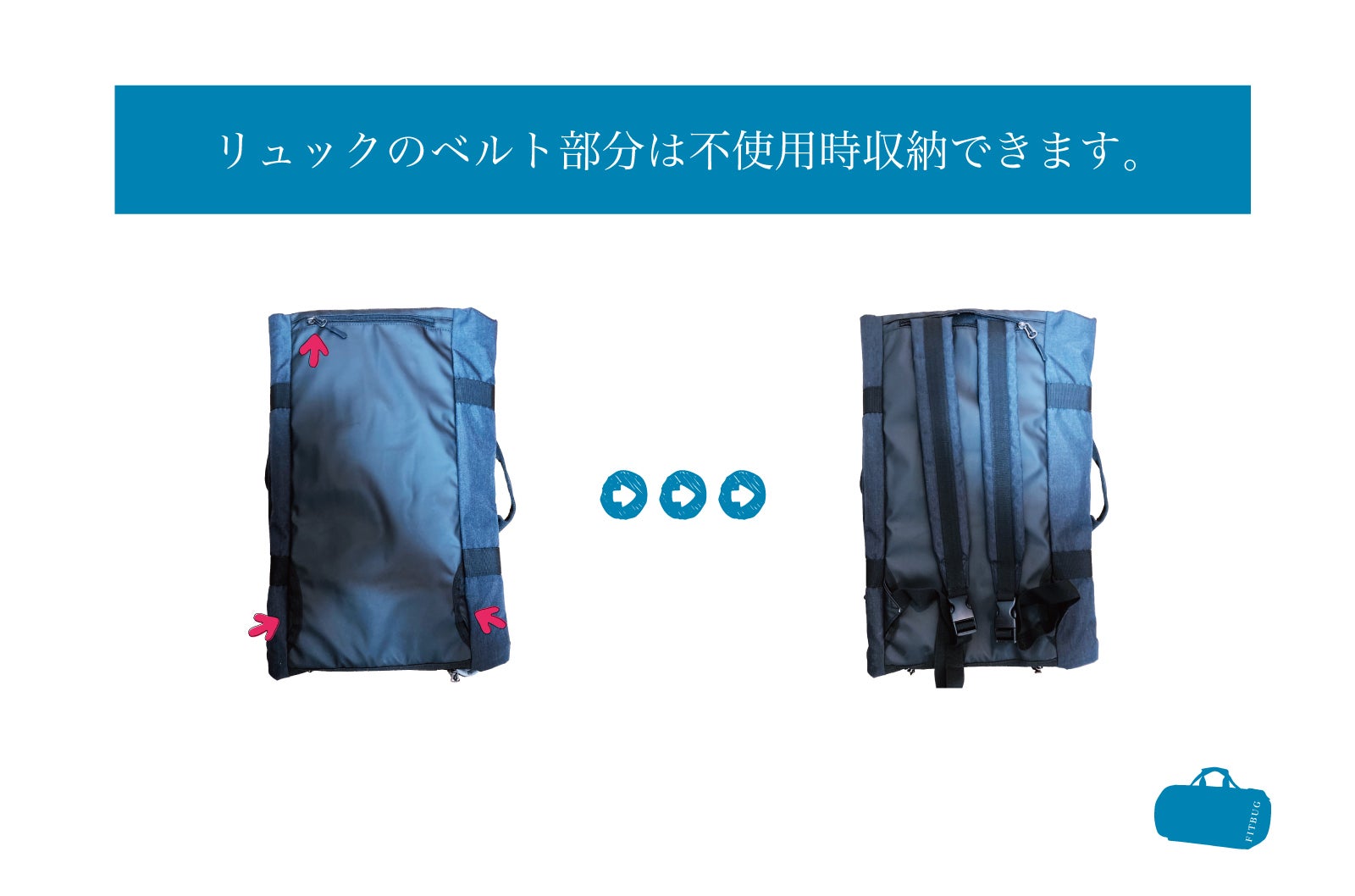 【FITBUG】はバッグの底面を利用し、ジャケットを折り畳まずに収納できるダッフルバッグです。