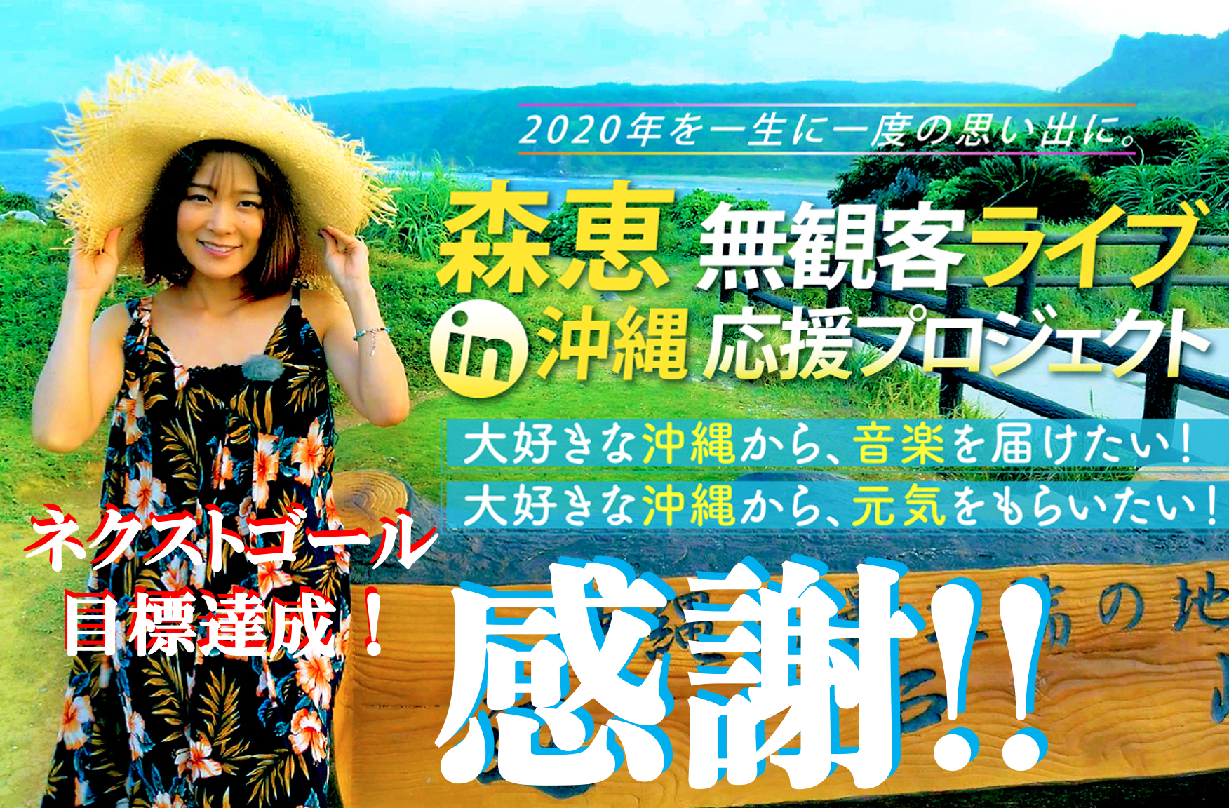森恵 自身初のクラウドファンディングで ネクストゴールを掲げさせて頂きましたが 本日、皆様のおかげで 目標を達成することが出来ました!本当に、本当に ありがとうございます!ネクストゴールを掲げさせて頂いた際に 公言させて頂いた通り、沖縄でのライブ視聴チケットの 満足度を高めるために 撮影場所を増やしたり、機材(ドローンを使った空撮など) や 写真集の制作費等に充てさせて頂いてます。皆様に本当に心から 満足して頂けるような返礼品を お届けしたいと思います。そして、プロジェクト終了まで 残り9日間あります。残り9日間で、さらなるネクストチャレンジを掲げる予定はありません。今回のクラウドファンディングとしてのプロジェクトは目標を達成することが出来ました。本当に 皆様のおかげです。ここから先は、どこまでいけるか見てみたいと思っております。皆様からご支援&応援して頂いた気持ちを しっかりと受け止めて、素晴らしいリターン返礼品をお届けできるように 頑張ってゆきたいと思います。そして残りのプロジェクト期間、一日も無駄のないように 全力で頑張ってゆきたいと思います。改めて、ネクストチャレンジにトライさせて頂き、そして達成する姿まで見させて頂き ありがとうございました。プロジェクト終了まで残り9日最後まで 一緒に 駆け抜けて頂けると 大変心強いです!いつも 森恵を応援して頂いてる皆様、本当にありがとうございます。引き続き 宜しくお願い致します!森恵 応援プロジェクト スタッフ