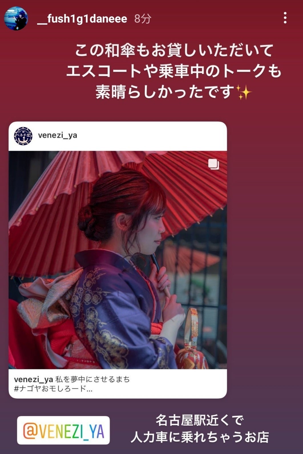 2021年ナゴヤde人力車プロジェクトにご理解とご支援をありがとうございました。コロナ禍ではありましたが、皆様のお陰で2020年初年度以上に飛躍の一年だったと感じています。1月クラウドファンディング、テレビ愛知出演2月ロゴ入り暖簾作成3月テーブル茶道練習、お花見4月ロゴ入り提灯作成、広報なごや掲載、東海テレビ出演、名古屋市西区公式YouTube出演5月振袖撮影会6月恋活人力車デート会、YouTube J.A.P.チャンネル出演7月夏の浴衣と人力車まつり、駄菓子販売開始8月浴衣撮影会、改装工事9月アイドル浴衣撮影会、名古屋駅モニター動画出演、駄菓子屋バー開店、ナゴヤアップデート祭クラファン参加10月アンティーク着物撮影会、虹のした音楽祭参加、名古屋大学講演、ハロウィンコスプレ会今後は、着物日和など商店街や町のイベントも次第に開催できそうです。街に人力車があることによって、お客様とお店や地域をご縁でつなぎ、さらに発展していく好循環を生んでいきたいと考えています。現スポンサー広告は2021年12月末で終了とさせていただきます。ご支援、誠にありがとうございました。2022年の募集については再度クラウドファンディングの予定ですので、どうぞよろしくお願い申し上げます。ベネチ屋