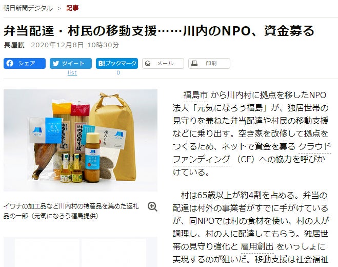 2020/12/10 08:38本プロジェクトが12月8日の朝日新聞福島版にて紹介されました!■記事全文はこちらから 「弁当配達・村民の移動支援……川内のNPO、資金募る」この掲載をきっかけに多くの人にプロジェクトを知って頂くことはもちろんですが、川内村の魅力や課題、これまでのあゆみやこれからの動きなどが広く周知されていく事を期待しています!プロジェクト終了まで残り2週間程度となりました…!これまで応援頂いた方の想いに応えられるよう精いっぱい取り組んで参りますので、引き続き温かいご支援をよろしくお願い致します! もっと見る