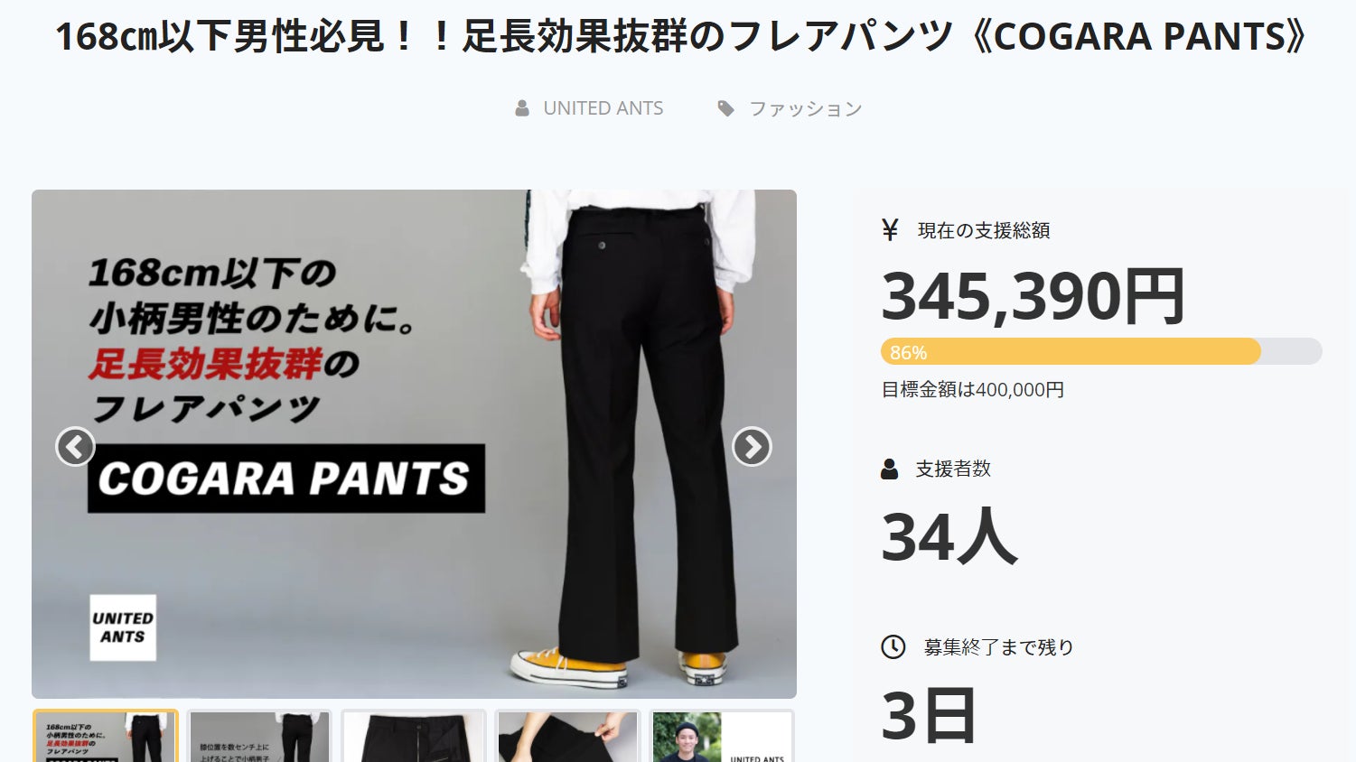 168㎝以下の小柄男性の為のフレアパンツCOGARA PANTS(コガラパンツ)のクラウドファンディング挑戦も残すところ2日となりました!本日もご支援頂き現在88%!残り約4万円となります!あと少し!改めまして普段小柄で合う洋服に出会えていない。周りに小柄男性がいらっしゃる方々は是非ともご協力お願い致します!最後まで頑張っていきます!