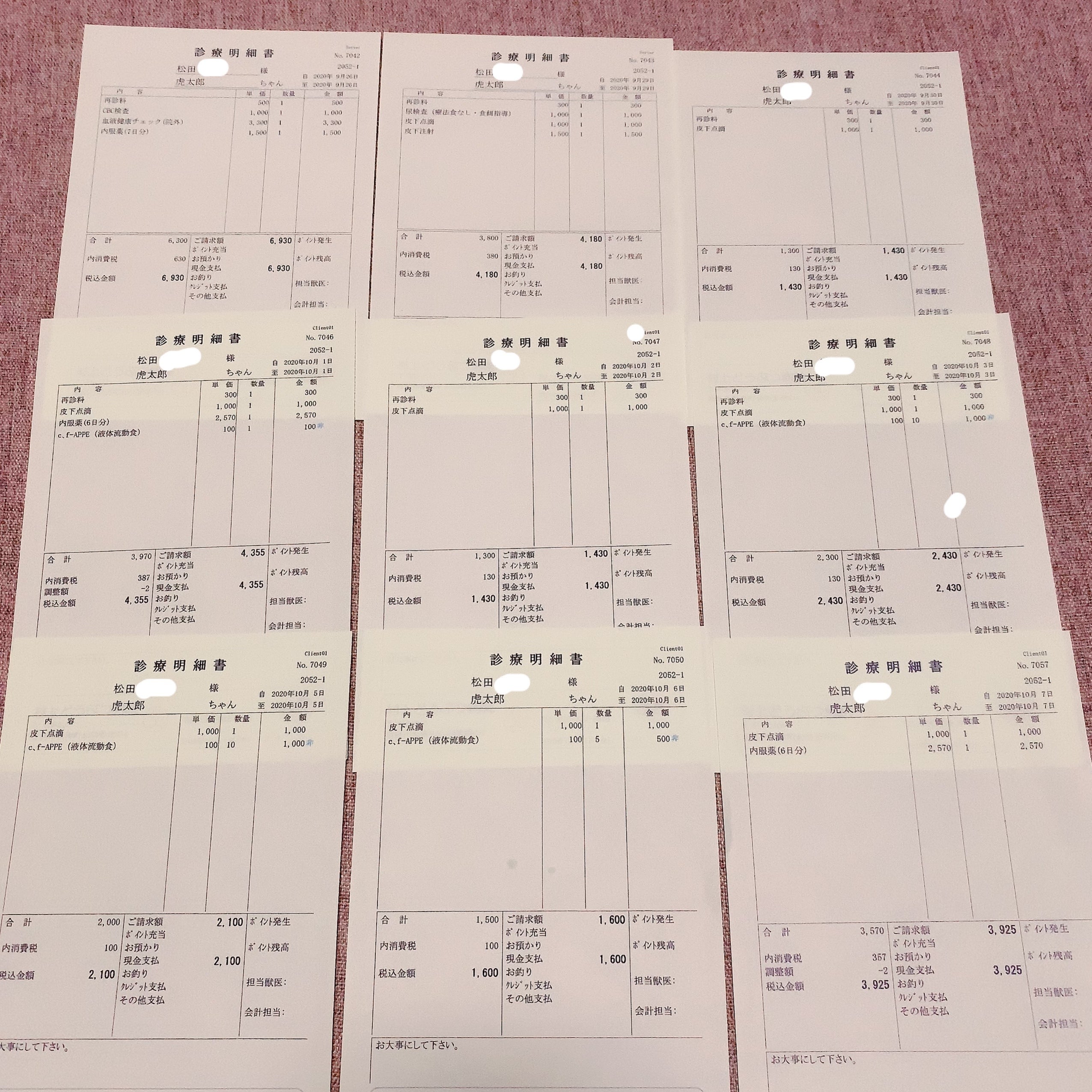 2020/11/21 18:51残り1日となりました。ご支援及び応援のメッセージありがとうございます。11/13〜20までの診療明細です。13日は点滴と腎不全のフード16日は点滴のみ18日は点滴とお薬と流動食20日は点滴のみ合計13475円でした。11/13病院待ちのこたちゃん。腎不全用のドッグフードもまた購入。2kgなのですぐなくなります^^;11/14天気が良い昼間のうちにお庭で日向ぼっこ(*^^*)11/16病院待ちのこたちゃん。助手席と後部座席を行ったり来たり落ち着きない。笑11/17近場で紅葉が綺麗な場所があったので少しお散歩へ。11/18病院待ちのうとうとしてるこたちゃん。11/19お腹の辺りが円形脱毛のようになり赤くボコボコしてることに気づき、翌日点滴の際に先生に報告。掻いている所を一切見てないけどこの間紅葉を観に行ったときに虫に刺されたのかと思いきや先生によると腫瘍の可能性が高いとのことでした。ただもう少し大きい状態じゃないと腫瘍かどうかの検査ができないみたいでこのまま様子を見ることになりました。以上が近況報告となります。明日でプロジェクトが終了となりますが、引き続き虎太郎の治療を継続していくので治療費の一部をご支援頂くと大変助かります。全て虎太郎の点滴、お薬、検査、腎不全用のフード(流動食も含む)代に使わせて頂きますのでよろしくお願い致します。 もっと見る