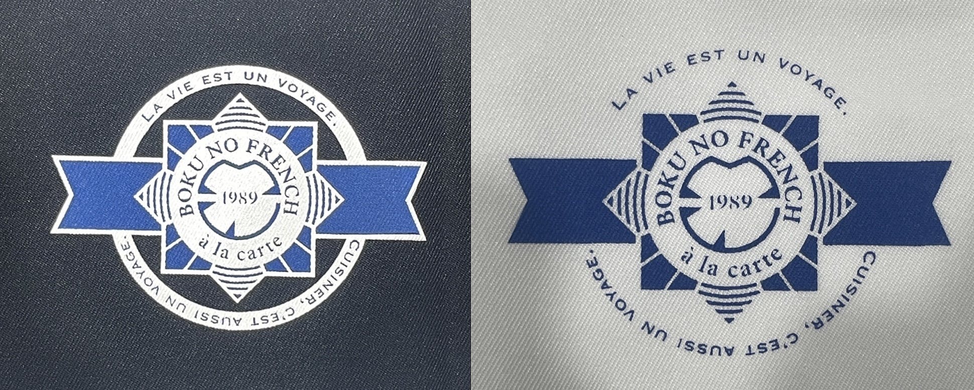 黒色のエプロンには左側の黒系マーク、白色のエプロンには右側の白系マークがプリントされます。