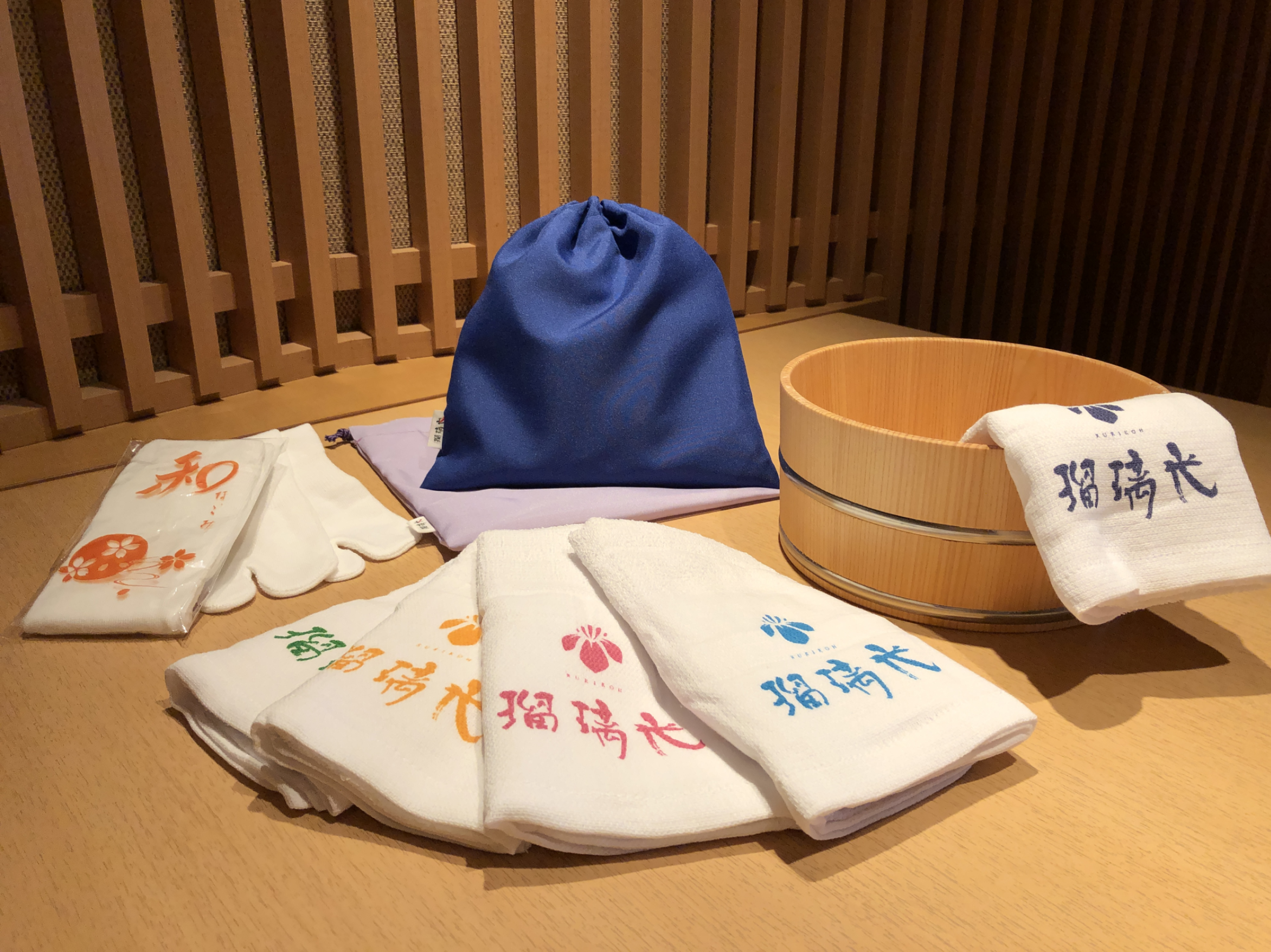 木桶に手ぬぐい…で、おうちで温泉ごっこができる「瑠璃光」セット。「葉渡莉」セットもご用意