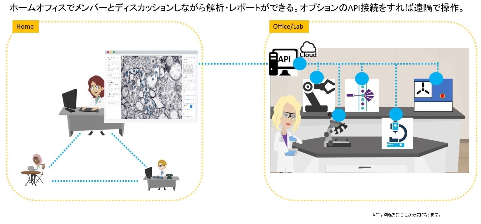 在宅やシェアオフィスなどの遠隔地にいてもバーチャルラボ・検査室を実現できます。