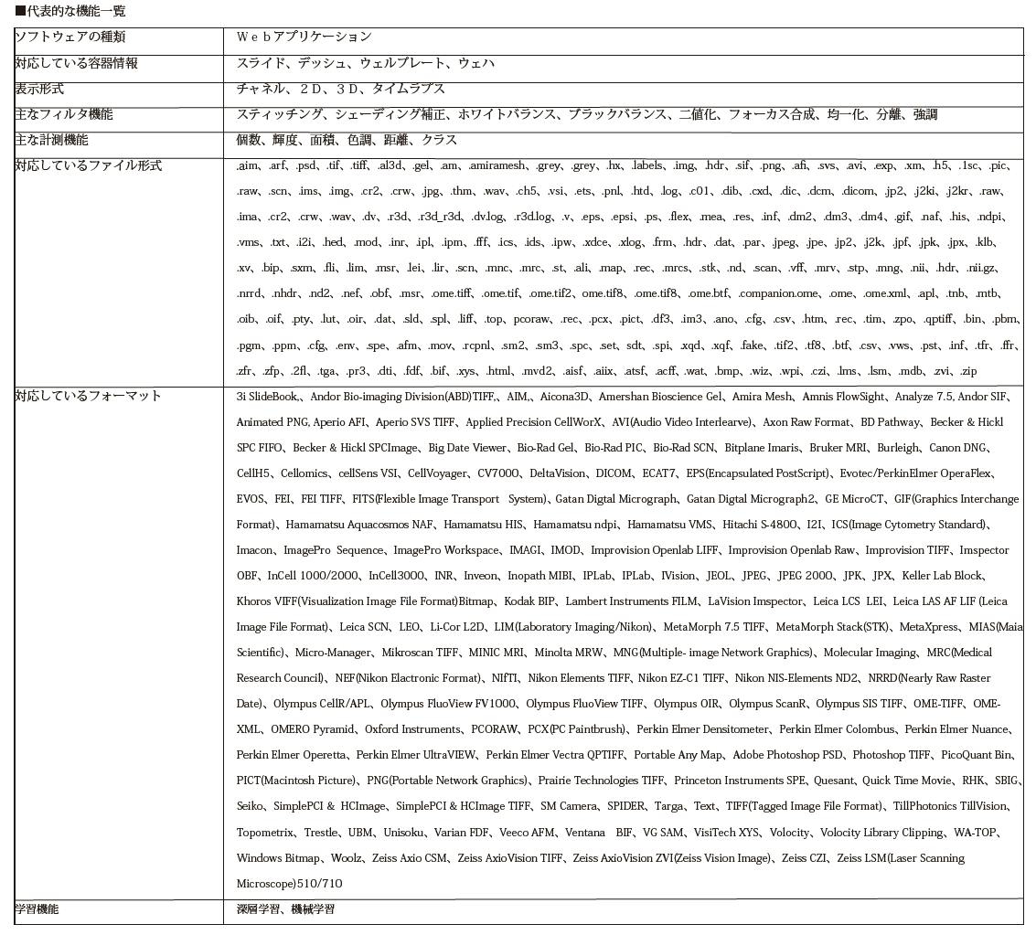 主なフィルタ機能:タイリング構築、フォーカス合成、二値化、二値化に伴う各種フィルタ、2D/3D/簡易デコンボリューション、クラス構築、クラス構築に伴うフィルタ